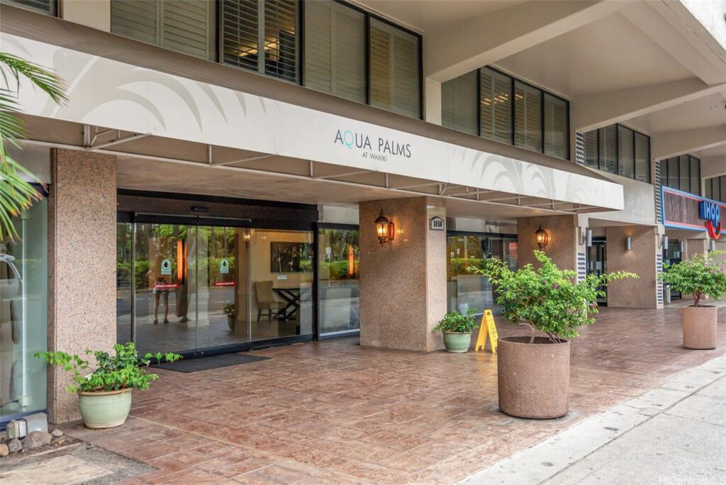 パームスアットワイキキはワイキキの西側ヒルトンハワイアンビレッジの道を挟んで向かい側に位置をするホテルコンドミニアムです。1階にはIHOPレストランがあり、同ブロック内にはABCストア、ワイラナコーヒーハウスがあります。私は以前こちらに宿泊をしたことがあるのですが、ロビーにはフリーの暖かいコーヒーレモン水、ユニークなことにフリーな日焼け止めの設置もありました。ハワイの不動産は廊下が暗い作りのものも多いですが、ここはホテルということもある明るい色で綺麗な印象を受けました◎