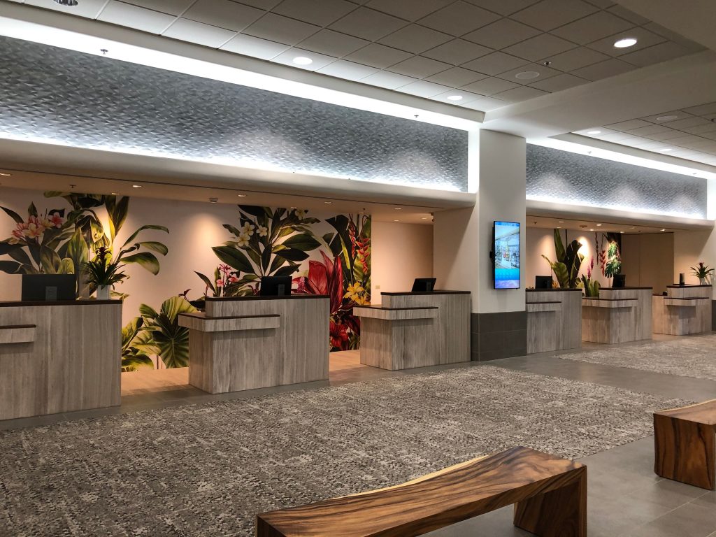 現在アラモアナホテルでは1階ロビー、エレベーターホール、エントランス車寄せ、プールなどの共有部分の大規模修繕を行っています。先月末にファミリーハワイリアルティスタッフが撮影した写真がこちらです。公式サイトによると9月27日までプールは使用できないと記載がありましたので9月末を目途に修繕は完了するのでしょうか。今までは緑を基調としたロビーでしたが、明るくハワイらしい、リゾートらしいロビーとなった気がいたします。エントランス車寄せとプールは修繕が進行中なため、追ってご紹介出来ればと思います。