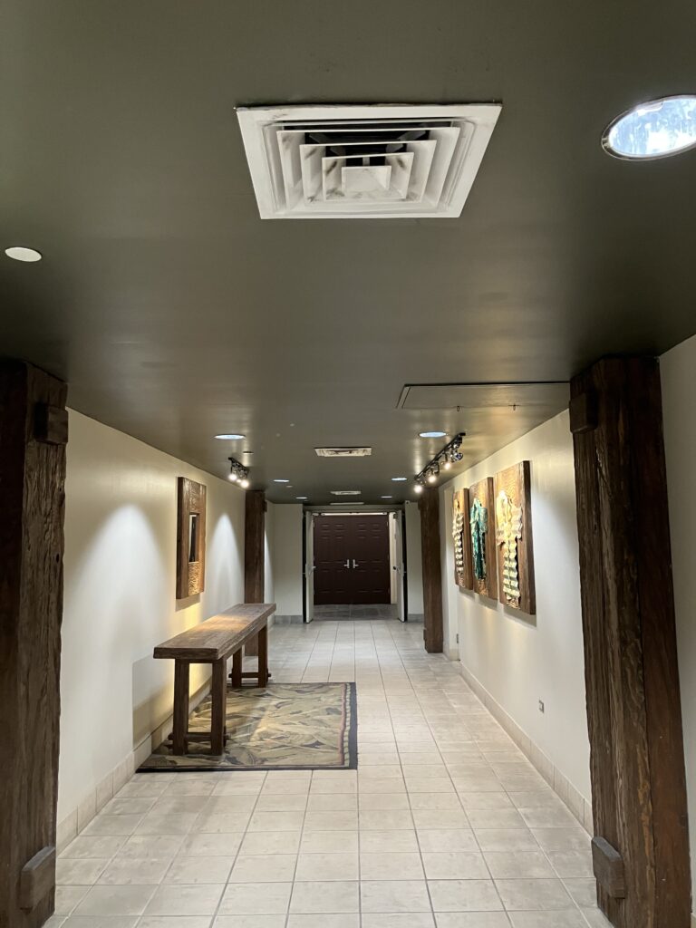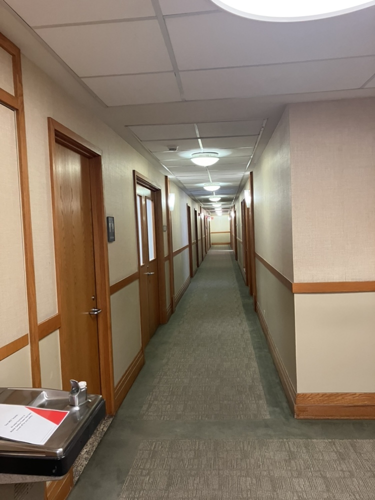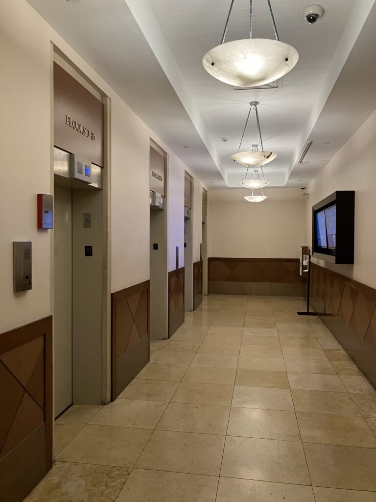 入口を入り真っすぐいくと正面にドアがあります。ドア上部の案内に沿って右に曲がり、エレベーターホールまで向かって下さい。