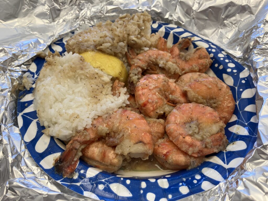 ワイキキエリアではなかなか珍しい殻付きのエビ、そして強めのガーリックが非常においしかったです!テイクアウトの可能でその際は写真のようにアルミホイルに包んで袋に入れてくれます。