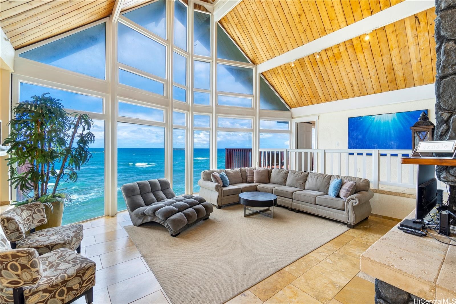 Breathtaking and stunning panoramic ocean views! Enjoy the soothings sound of the ocean, beautiful sunset, and stargazing from this quiet, private oceanfront home on Laie Point. This 3,879 square foot 7 bedroom 4 1/2 bathroom home could either be lived in as one large home, or as two separate units: a 5 bedroom 2 1/2 bathroom home upstairs and a 2 bedroom 1 bathroom Ohana with full wet bar. Very close to a long white sandy beach, this beautiful home features an open floor plan with high vaulted ceilings, and spacious lanais. Very close to the Ritz Carlton Turtle Bay Resort, BYUH, the Polynesian Cultural Center, world class golf and surfing, restaurants, and shopping. Very easy to view on short notice. Welcome home to paradise!