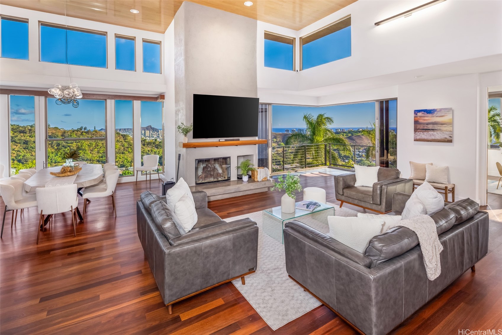 Contemporary Elegance! Welcome to this extraordinarily designed custom home by architect, Jim Schmit. The floor plan is masterfully designed toward the focal points of spectacular views from Diamond Head to Pearl Harbor to the Ko'olau Mountains. Monumental ten feet tall Bonded Bronze entry doors greet you and lead to the grand two-story living room. Stepping into the living room is an unexpected "WOW" experience at the sight of breathtaking, unobstructed views. Australian Chocolate Heart Brushbox hardwood floors, double cantilevered living room walls, an ASID Award winning kitchen and clean, elegant architectural lines create a timeless design for this home. You'll enjoy waking up to amazing views of Diamond Head, Waikiki, Punchbowl and vistas out to the ocean from your primary bedroom suite. The lower-level recreation room with tumbled Travertine floors leads out to the wonderful lanai, spa and lap size pool complete with more gorgeous views. Discretely set back from the street, this extraordinary home offers privacy and a great location with its proximity to Downtown and major highways. You'll love coming home to enjoy living in this remarkable home!