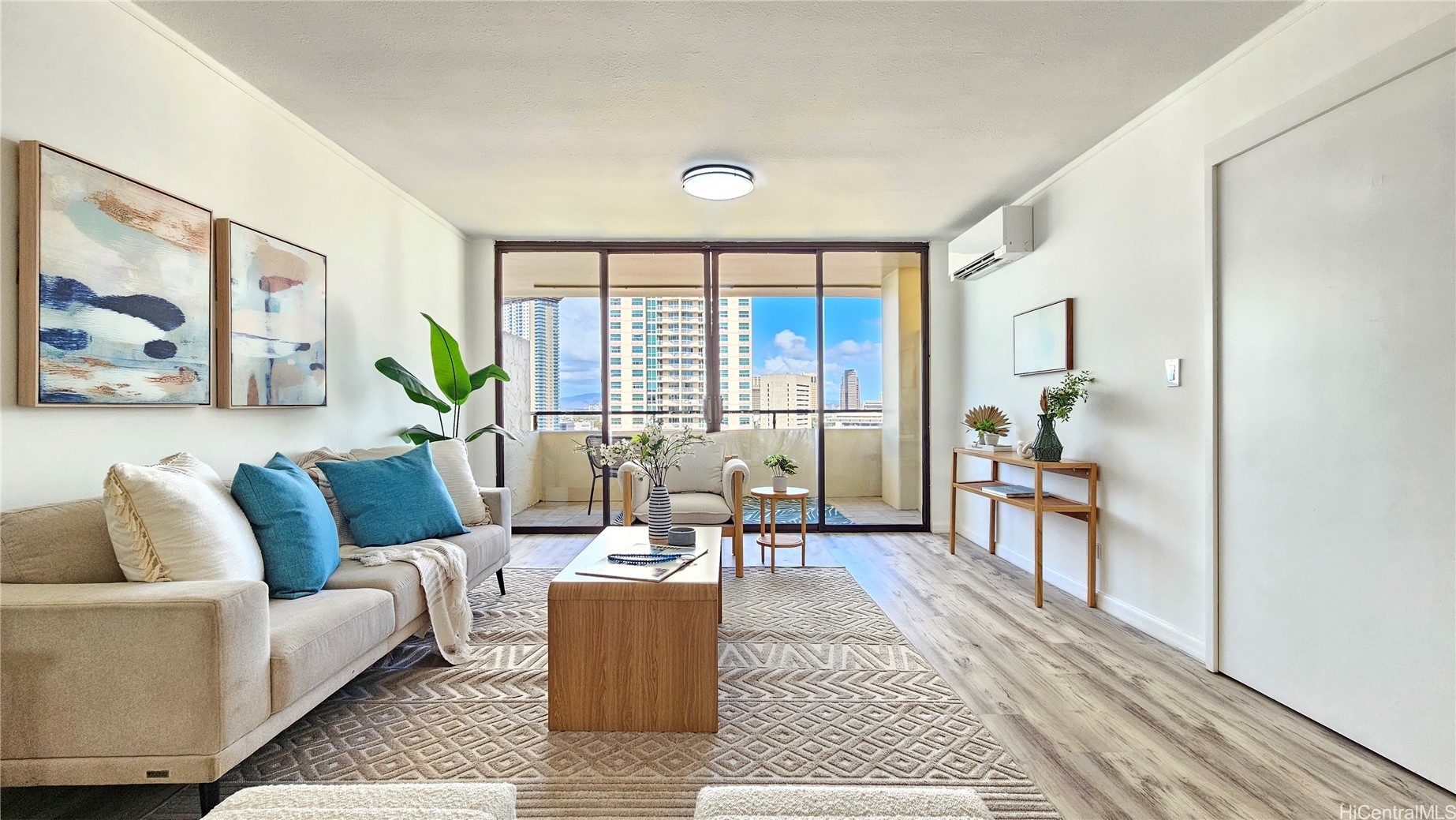 Experience penthouse living in this single-level unit offering sweeping mountain, city, and partial ocean views. Thoughtfully updated, the home features a new refrigerator, microwave, stove, washer, dryer, and brand-new split air conditioning in every room. Two beautifully renovated bathrooms include both a shower and a tub. Custom lighting enhances every space. Positioned on the quiet side of the building, this residence combines comfort with unbeatable convenience. Step across Ward Avenue to enjoy Blaisdell Center’s concerts, theatre, sports, and weekly farmers markets. Stroll to Thomas Square Park and the Honolulu Museum of Art or explore the growing neighborhood with exciting new restaurants and shops on the way. Just minutes from Ala Moana Shopping Center, the beach, a movie complex, and the state’s largest Whole Foods. A planned rail station nearby adds future value. Amenities include locked storage for surfboards and bikes, plus gated parking with a stall right by the lobby.