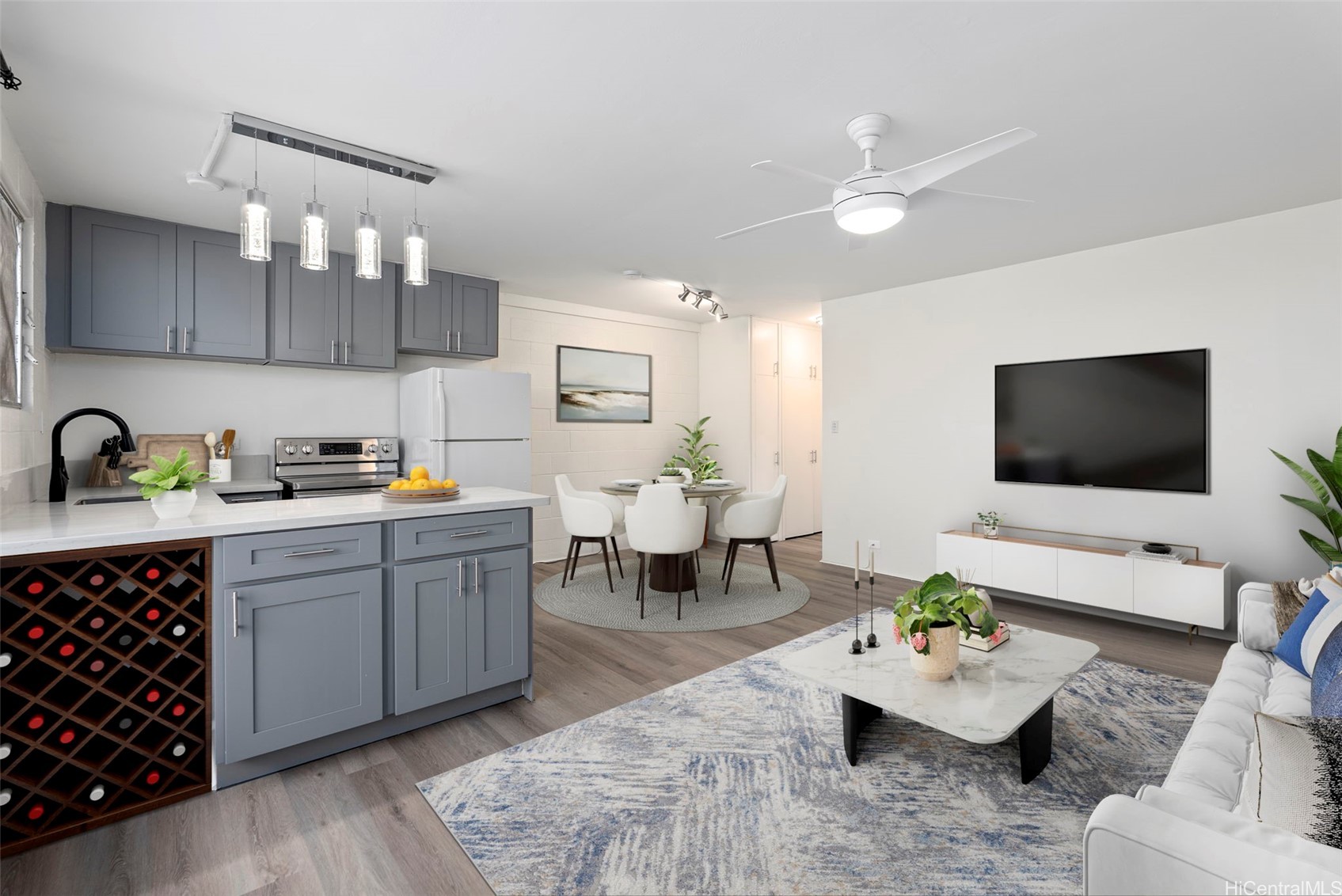 Rarely available - don't miss your chance at Punahou Park Place! This renovated 1-bedroom, 1-bath with 1 partially covered parking stall is move-in ready and packed with upgrades. A sleek, remodeled kitchen thoughtfully opened to overlook the living and dining areas, featuring glass pendant lighting, quartz countertops, and additional cabinetry. The home also offers an updated bathroom, vinyl plank flooring throughout, refreshed lighting and ceiling fans, bedroom AC, and the complete removal of all popcorn ceilings! Bright and breezy with lots of windows, this unit offers extra privacy and a lanai overlooking Makiki Neighborhood Park and community garden. Conveniently located near UH Manoa, Kapiolani Medical Center, Ala Moana, shopping, dining, and freeway access. Perfect for first-time buyers or savvy investors. This one won't last long! *Building has 100% hurricane coverage.*