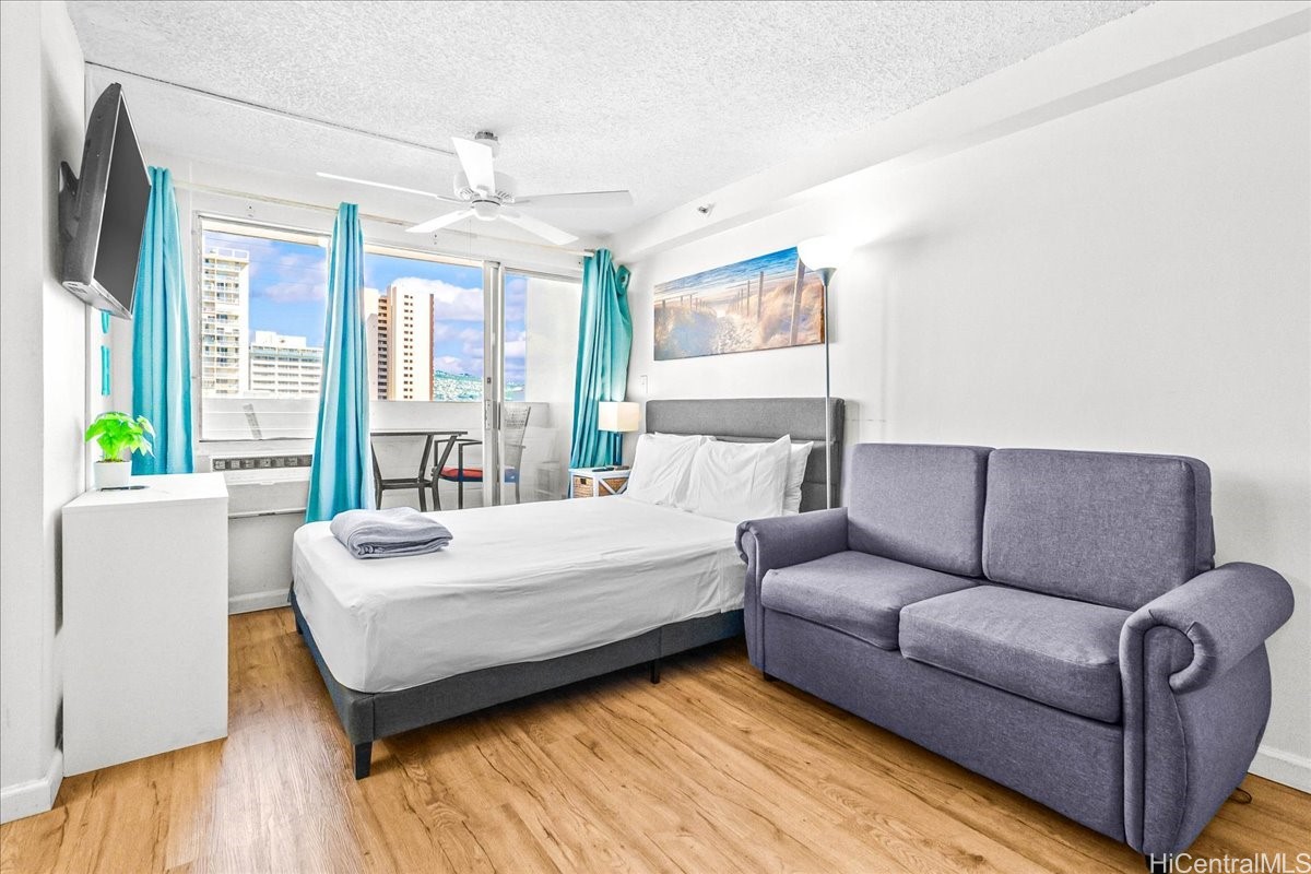 Introducing a fee simple, fully furnished studio currently operating as a short-term rental at Kuhio Village 1—zoned for legal short-term rentals. This well-situated unit enjoys city, golf course, and mountain views, adding to its appeal for both owners and guests. Thoughtfully designed with a smart, efficient layout, the studio features an open lanai and tasteful upgrades throughout, making it ideal for Airbnb and other leading short-term rental platforms. As a proven income-producing property with high income and occupancy rate. Located just moments from Waikiki Beach, the vibrant Waikiki Strip, Royal Hawaiian Shopping Center, and International Market Place, guests can experience the best of Waikiki right outside the door. The all-inclusive HOA fee covers electricity, cable TV, hot water, sewer, and common area maintenance—providing ease of ownership. Kuhio Village is a boutique building featuring an open-air lobby, on-site shops, and added security, making it especially appealing to vacationers and investors. An exceptional blend of Waikiki lifestyle and investment potential—this opportunity should not be missed!