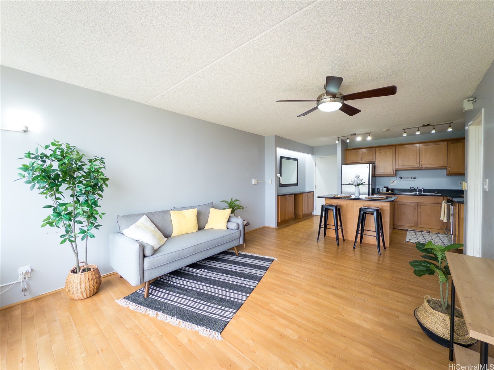 Very well-priced high-floor 1-bedroom, 1-bath residence at Pearl Regency featuring the rare convenience of two parking stalls, so no need to hunt for street parking. Located on the cooler mauka side of the building, this unit enjoys refreshing trade winds and peaceful views overlooking the Pearl at Kalauao Country Club. The remodeled open-style kitchen offers an eat-in island, modern cabinetry, updated lighting, sleek countertops, and stainless steel appliances, making it ideal for everyday living and entertaining. Wood-style flooring flows throughout, complemented by air conditioning in both the living room and bedroom. Step out onto your private lanai to relax and unwind, and enjoy the convenience of an in-unit, side-by-side, full-size washer and dryer. Pearl Regency offers resort-style amenities including a pool, hot tub, tennis court, fitness center, BBQ areas, recreation room, and 24-hour security. Conveniently located near Pearlridge Shopping Center, freeway access, dining, entertainment, hospitals, and schools. Experience the best of comfort and convenience in one of Aiea’s most sought-after buildings. NOTE: Images have been digitally enhanced.