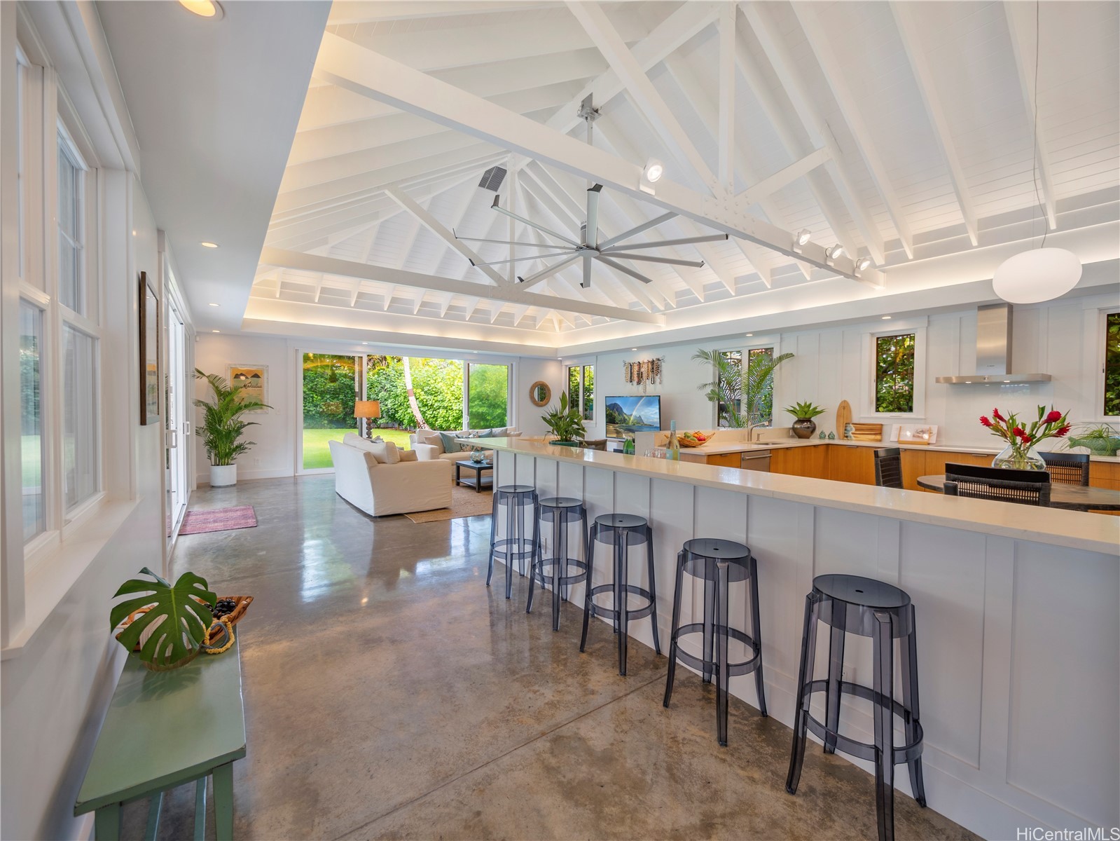 This impeccable Lanikai residence is an architectural gem, crafted with exquisite millwork & detail. Built in 2014, it offers the timeless charm of Hawaiian plantation style with clean, modern elegance. On an oversized level lot, the 5-BR, 4-BA home features incredible natural light, reflecting upon impressive vaulted ceilings, through expansive windows & doors. Neutral, polished concrete floors at ground level are both functional & beautiful, with rich hardwood upstairs. The generous living space seamlessly extends outdoors to a wide covered lanai, & a 40-ft shimmering tiled pool and spa, surrounded by lush, colorful landscape. At ground level, are 2 spacious BR with high ceilings & a full BA which can be used singly, or together as a large guest suite with separate entrance; a laundry room; & another full bath, with indoor/outdoor shower, perfect for rinsing off after a visit to Lanikai Beach, just six houses away. Upstairs, 3 BR & 2 full BA are divided into 2 wings by a grand staircase, offering separation for the primary suite. A large garage and driveway parking complete the package. Don't miss this exceptional opportunity to own in one of Oahu's most desired neighborhoods!