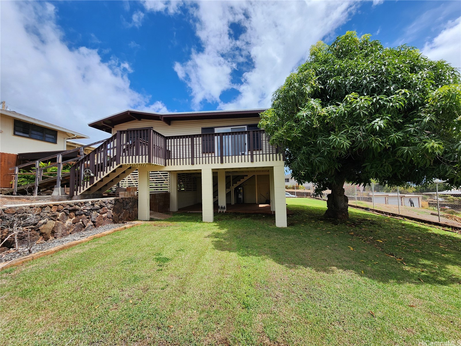 In Pearl City, located overlooking the Pearl City Shopping Center. 3-Bedroom, 1.5-bath house on a corner lot. No neighbor on Makai left-side, has good view of the neighborhood. House has "good bones" and is in good structural condition. House exterior trim and interior has been newly painted and roof has been recently silicone coated. Kitchen is in original condition and has NO appliances - opportunity for Buyer to remodel/renovate to their desire. House interior also needs new floor coverings or the original hardwood floors can be refinished. House built elevated above ground and has a partially enclosed garage, laundry/wash room area with an adjoining toilet and covered patio area on the ground floor. Lots of storage area under house. Property is fully enclosed with walls and fencing. Deck and ramp at rear of house was built without a Building Permit. Property to be sold in "AS-IS" Condition.