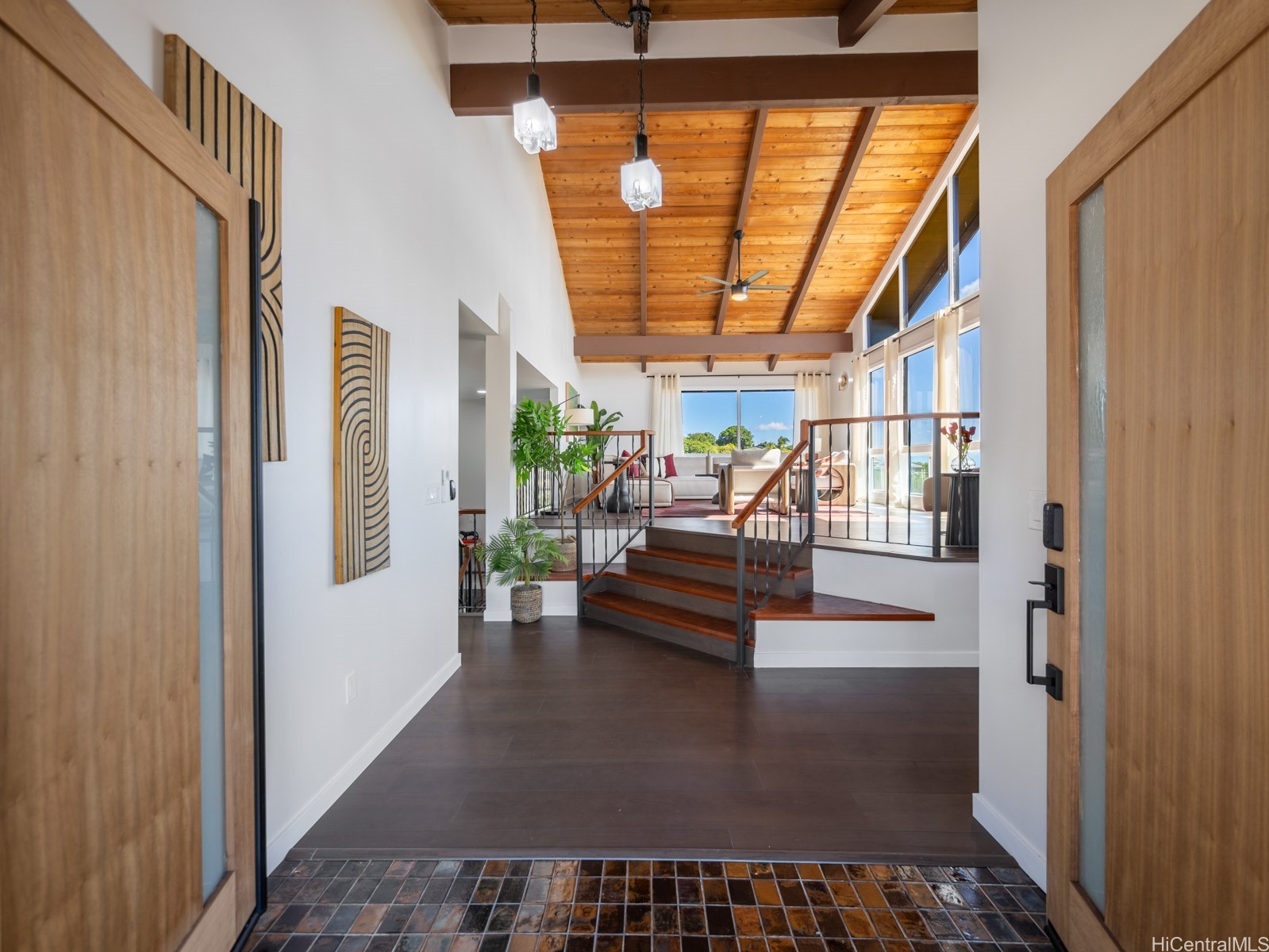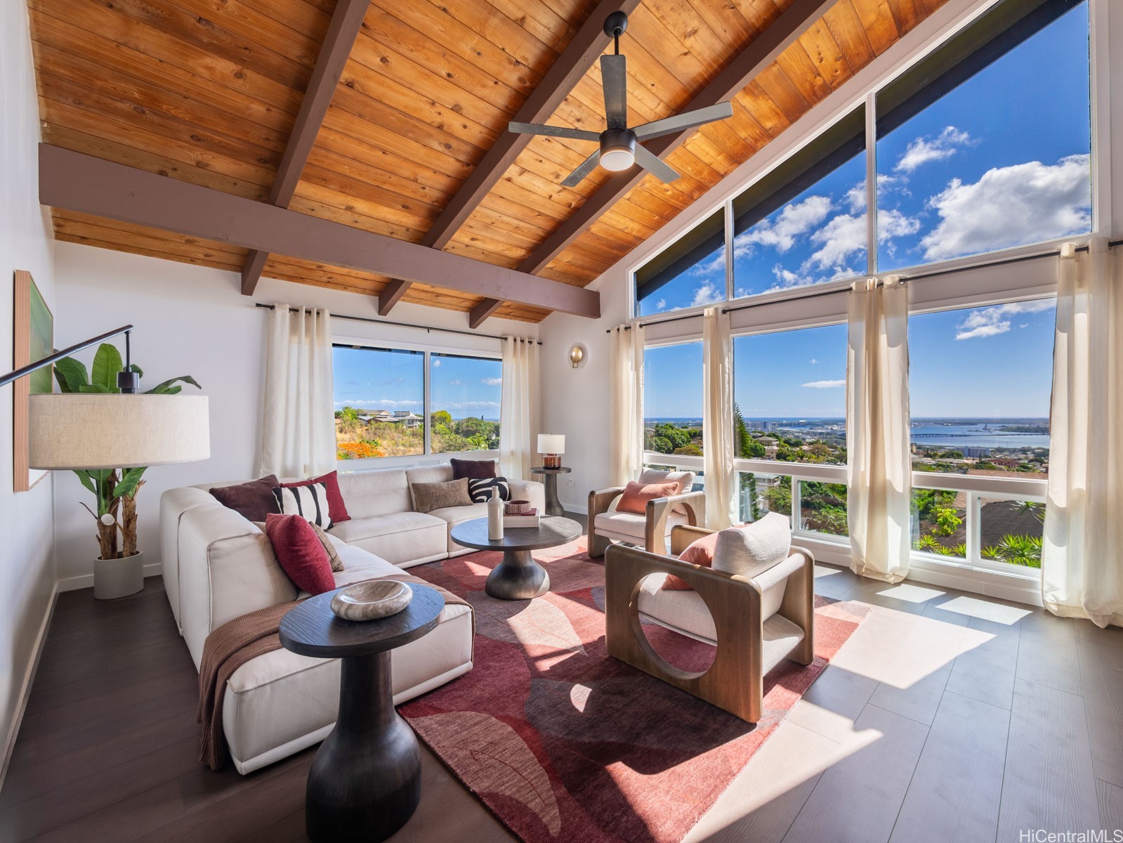 Welcome to this unparalleled residence that rivals the most prestigious neighborhoods and redefines luxury living in Aiea Heights. This exceptional home has been fully + meticulously renovated and boasts expansive ocean views, 5 spacious bedrooms, 3.5 bathrooms and sits on an oversized 20,711 sf lot. With beautiful high ceilings and steel-frame construction, this home offers unique mid-century modern architecture that flows seamlessly throughout the indoor and outdoor spaces. The primary bedroom suite on the main floor is a haven of tranquility, complete with a large, luxurious en suite bathroom that promises a spa-like experience every day. Designed for both relaxation and entertainment, this home features a wrap-around deck, sophisticated cigar + whiskey lounge, an indoor sauna, and a rumpus room with a wet bar—perfect for hosting guests or unwinding in style. Located on a highly desirable street with underground utilities and great curb appeal. This property also holds potential for future development on the lower part of the lot, extending down to the street below, offering possible investment opportunities.