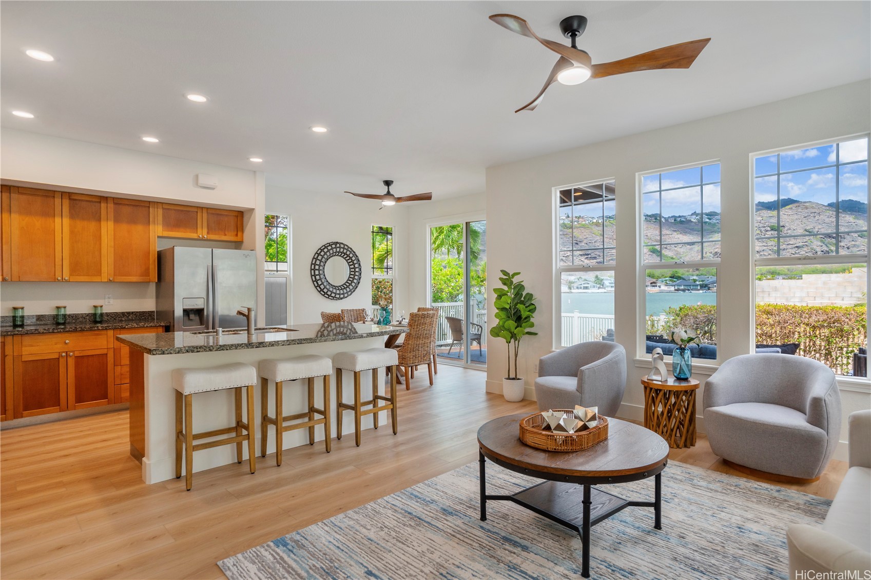 Rare Opportunity in The Cottages! Experience refined island living in the prestigious Hawaii Kai Peninsula community. This waterfront residence—attached only at the 2-car garage—features an expansive wraparound yard with serene marina views. This home features a two zone, central A/C system allowing you to cool upstairs or downstairs individually. 2025 renovations include new luxury vinyl plank flooring, fresh interior paint, modern recessed lighting, new toilets and faucets, stylish ceiling fans, and a beautiful Acacia wood deck tile system that transforms the backyard into a stunning outdoor retreat. The versatile layout offers 3 bedrooms and 2 baths upstairs, plus a downstairs flex room and a full bath—perfect for a 4th bedroom or office. The light-filled living and dining areas open seamlessly to the private yard, ideal for entertaining or relaxing. Enjoy resort-style amenities: pools, spa, fitness center, BBQ areas, walking paths, marina promenade, playgrounds, and 24-hour security. A true blend of comfort, style, and island luxury!