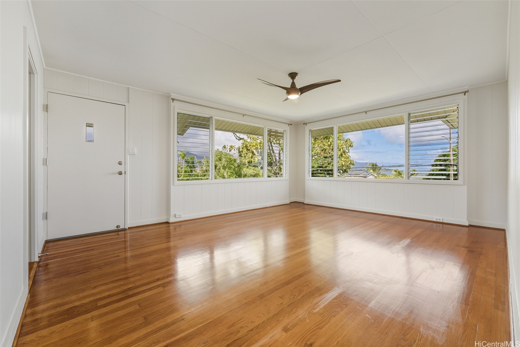 Experience kama'aina living in this beautifully updated single-family home on a desirable corner lot. Recently renovated with a brand-new kitchen and bathroom. Bathroom features a dual vanity with Quartz countertops, lighted mirrors, and tub with shower. Kitchen has contemporary color scheme with blue lower cabinets and white uppers with stainless steel appliances and Quartz countertops. The house has been freshly painted inside and out. A fully fenced yard and new gutters add to the appeal and functionality. Inside, the home showcases original oak floors offering timeless warmth and charm. The living room enjoys expansive views of Kaneohe Bay from large window. The 2 car carport includes 2 large storage closets and a lavatory. A spacious covered patio offers a comfortable area for relaxing or entertaining, rain or shine. The property also features a mature avocado tree, mock orange hedge & a well maintained yard. Conveniently located with easy access to H-3, Pali & Likelike Highways, this move-in ready home combines classic island character, modern updates, and a prime Windward O'ahu location. Entrance to property is on Mikiola Drive. To be sold in AS IS Condition.