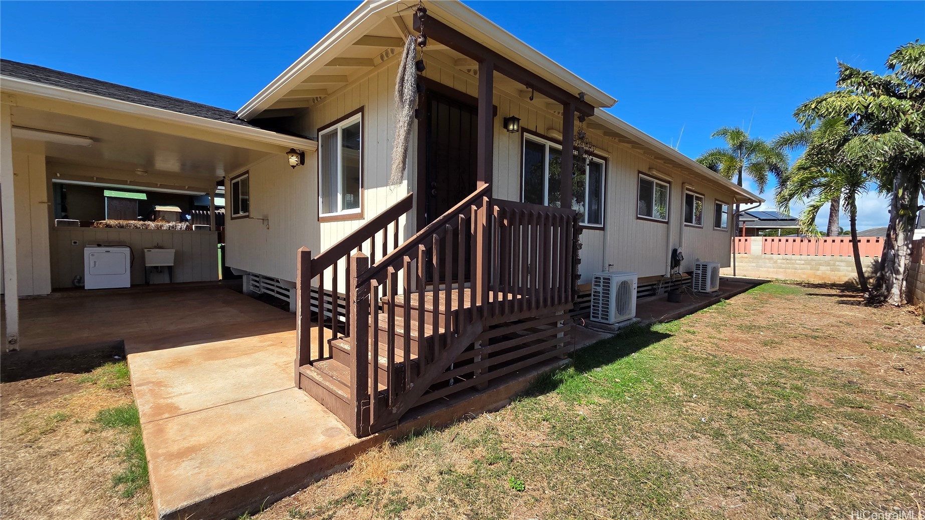 Peaceful cul-de-sac in Ewa Villages, this 4-bed, 2-bath single-level home offers easy living. A large living area to a bright kitchen. Large closets for extra storage, plus the private primary bedroom featuring an en-suite bath and double closets. Just open the front door and enjoy the island breeze throughout the whole house with the convenience of large vinyl windows, or gain total control over your comfort and energy costs with five split A/C units (air conditioning in every bedroom installed in 2020) powered by a 34-panel, 3-battery Sun Run PV system (installed 2019), leased system-to-be-owned at closing. Roof replaced in 2023. Large carport and a private yard with plenty of space to play or relax, and add your own touches. The long driveway allows additional parking. Additional off-street space is also available. Your home-sweet-home is right here and waiting for your personal touches—washer and dryer hookups in the carport. The seller plans to paint the interior by mid-November and will update the pictures then. Ideally located with easy freeway access, just minutes from golf, beautiful beaches, shopping, restaurants, schools, and more. EZ to see now!