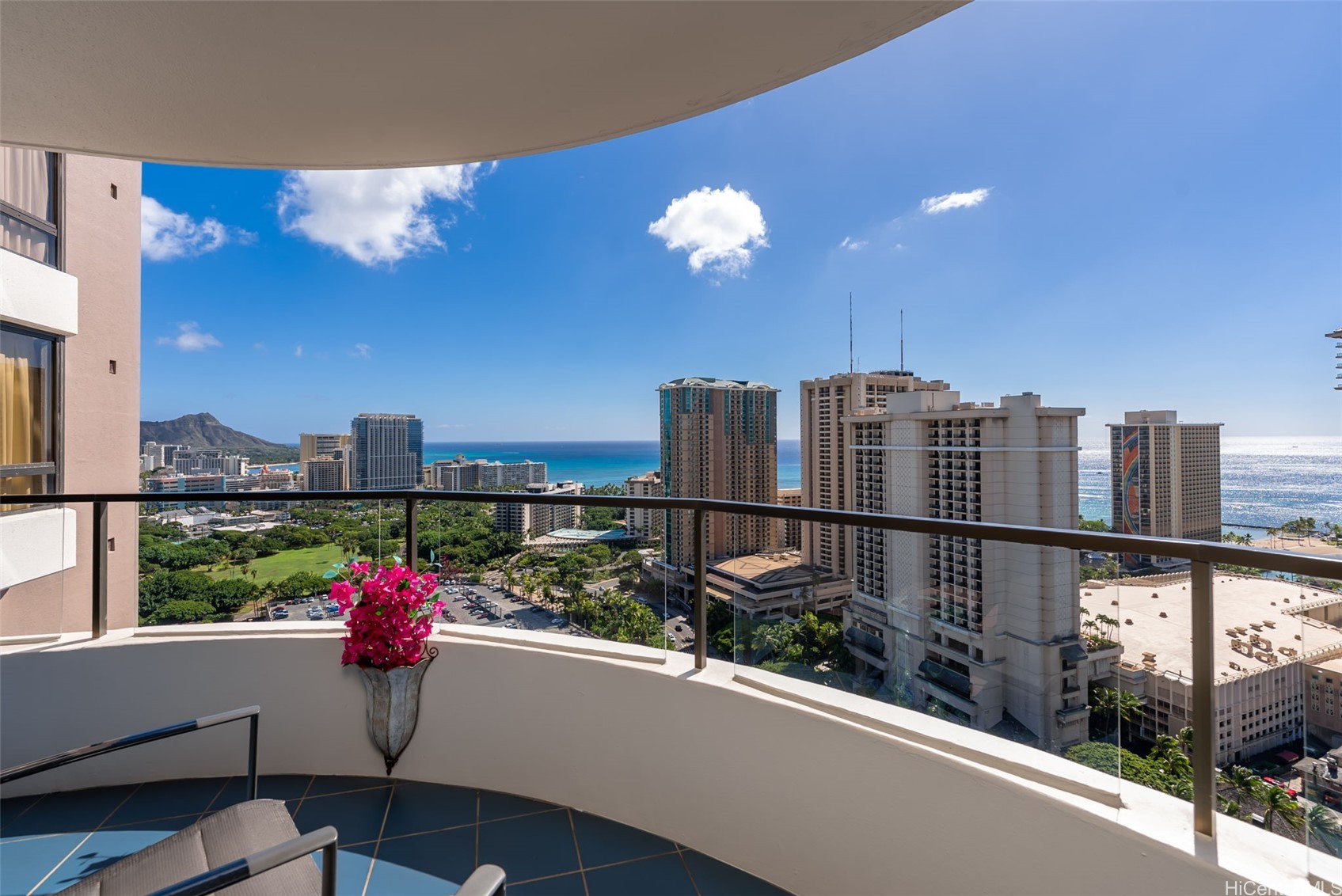 Residence #32A commands one of the most dramatic vantage points in all of Honolulu. Perched on the 32nd floor, where the exclusive penthouse collection begins, & spanning the full width of the building, this prized corner unit showcases nearly 270° of unobstructed, panoramic views—from Diamond Head to the ocean, mountains, & city lights. Enjoy a one-of-a-kind, multi–million dollar view experience from every room and 2 wrap around lanais that no other Hawaii home can offer. With its rare east-to-west orientation, #32A captures sunrise to sunset views & provides a front-row seat to the weekly Friday night fireworks show. Designed by acclaimed interior designer Glenda Anderson & thoughtfully updated over the years, every detail of this residence has been meticulously planned & beautifully executed. Exceptionally located within moments to world famous Waikiki beach, & the dining, entertainment, & recreational hub of the Pacific. All furnishings & a car are available at no cost for a truly turn-key, move-in ready purchase. Amenities include a pool, spa/sauna, BBQ, & pickleball court. Pet-friendly (2 pets ok). Bldg. allows min. 30 day rental. HOA includes all utilities. Sold AS-IS.