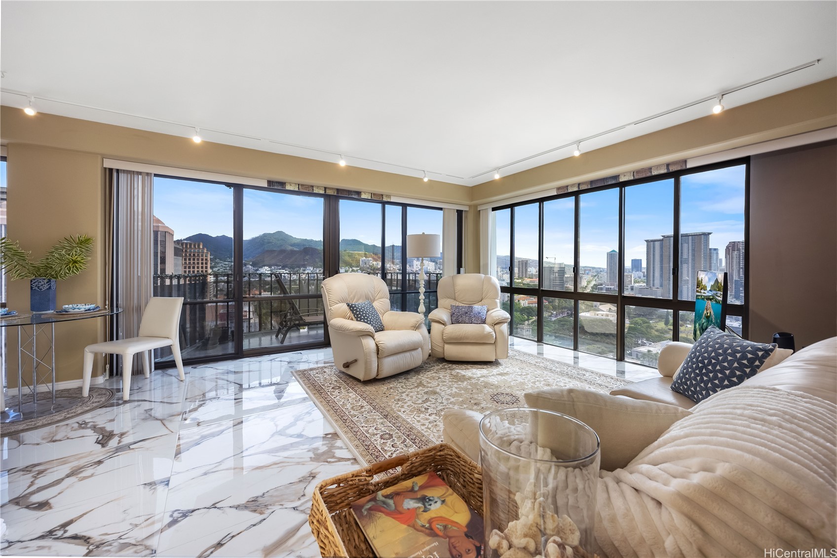 Here's a fantastic opportunity to experience the best of island living in this rarely available, high-floor, ‘06 corner unit on the cooler side of Harbor Square Tower. This spacious two-bedroom unit offers a private retreat with wraparound mountain, city, and ocean views from floor-to-ceiling windows and a breezy open lanai. Beautifully updated and meticulously maintained, this home features new marble floors, modern finishes, and an open-concept kitchen with granite countertops and new stainless steel appliances. Both bedrooms enjoy stunning views and remodeled en-suite bathrooms. Ample storage includes extra in-unit closet space, plus an additional storage locker. Enjoy the comfort of central A/C, with utilities, cable, and high-speed internet included in the maintenance fee. The secure, well-managed building is fully insured and offers excellent amenities, including a recently renovated pool area. Ideally situated in metro Honolulu, this home provides easy access to H-1, Nimitz Highway, Queen’s Medical Center, the State Capitol, and the Prince Kuhio Federal Building. It's a unique and wonderful spot to work, play, or stay in the heart of Town.