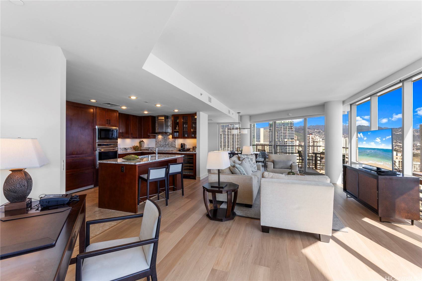Just minutes from Waikiki Beach, this elegantly upgraded corner unit offers true resort-style living. Enjoy convenient access to a wide variety of nearby restaurants, as well as on-site dining and room-service options available through the hotel. Take in sweeping panoramic views of the city skyline framed by the mountains, Koko Crater and Koko Head in Hawaii Kai, Diamond Head, and the iconic Pink Palace with Waikiki Beach as its backdrop. Relax on two separate lanais: one off the primary bedroom facing the ocean and the other off the living-dining area with beautiful mountain views. The residence features a well-equipped kitchen, generously sized bathrooms, ample storage—including a walk-in closet in the primary bedroom—and thoughtful details throughout. Recent updates include brand-new engineered hardwood floors, adding a gentle sense of warmth and comfort throughout the home. It is a place that truly soothes the heart, reminding you how important the floor can be. New modern roller shades are designed to maximize the stunning 180-degree views unique to this corner unit. Experience luxury island living at its finest.