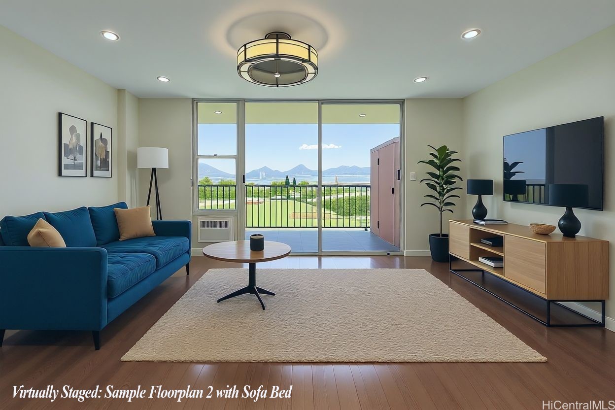 Step into the luxurious Kemoo By the Lake #810—a fully remodeled modern studio with a 98 sq ft lanai showcasing serene mountain views and postcard sunsets. This designer space features a chef-inspired kitchen with quartz countertops, subway tile walls, a River White island, & a full suite of premium stainless appliances including full-sized Haier quad-door refrigerator, Blomberg convection range, Midea dishwasher, convection oven microwave, & touchless faucet. Enjoy in-unit laundry, beautifully integrated with cabinetry and high-efficiency LG washer/dryer. The spa-quality bathroom impresses with floor-to-ceiling quartz, KOHLER cast-iron soaking tub with glass doors, double-sink vanity, LED anti-fog mirror, & premium Delta fixtures. A sleek Murphy wall bed with desk, recessed LED lighting, luxury vinyl plank flooring, air conditioning, smooth-finished walls/ceiling & smart Schlage keypad lock elevate everyday comfort.Perfectly located across from Schofield Barracks with easy freeway access—modern living, maximum convenience, and exceptional upgrades throughout. (see supplements for complete Renovation List).