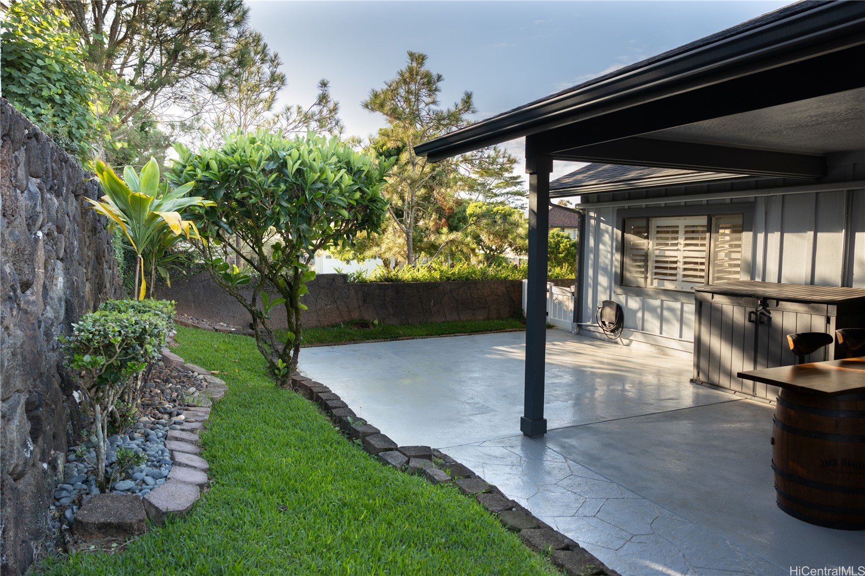 Just a short walk to Mililani Elementary and Middle Schools and Rec Ctr 7. This single story home has a versatile den, tastefully renovated with modern comfort, island charm, with true family living in mind. As you step inside, you're greeted by an elegant dining area and a stunning brand new kitchen - complete with a spacious island, corner coffee bar, and beautiful finishes throughout. The kitchen flows seamlessly into a large family room, highlighted by vaulted ceilings. The den is a thoughtfully designed as a multi-purpose room featuring custom cabinetry and a Murphy bed. Perfect as a home office, laundry room, or guest retreat - flexible space truly adapts to your lifestyle. Down the hallway, you'll find two comfortable bedrooms and a full bathroom with double sinks, ideal for family or guests. The primary suite is a true sanctuary. Custom closets, nightstands, and dressers fill the space with luxury and organization. The ensuite bathroom features a large walk-in shower and dual sinks. Step outside to a spacious, partially covered patio, perfect for entertaining friends, hosting family gatherings, or simply enjoying the cool Mililani breezes.