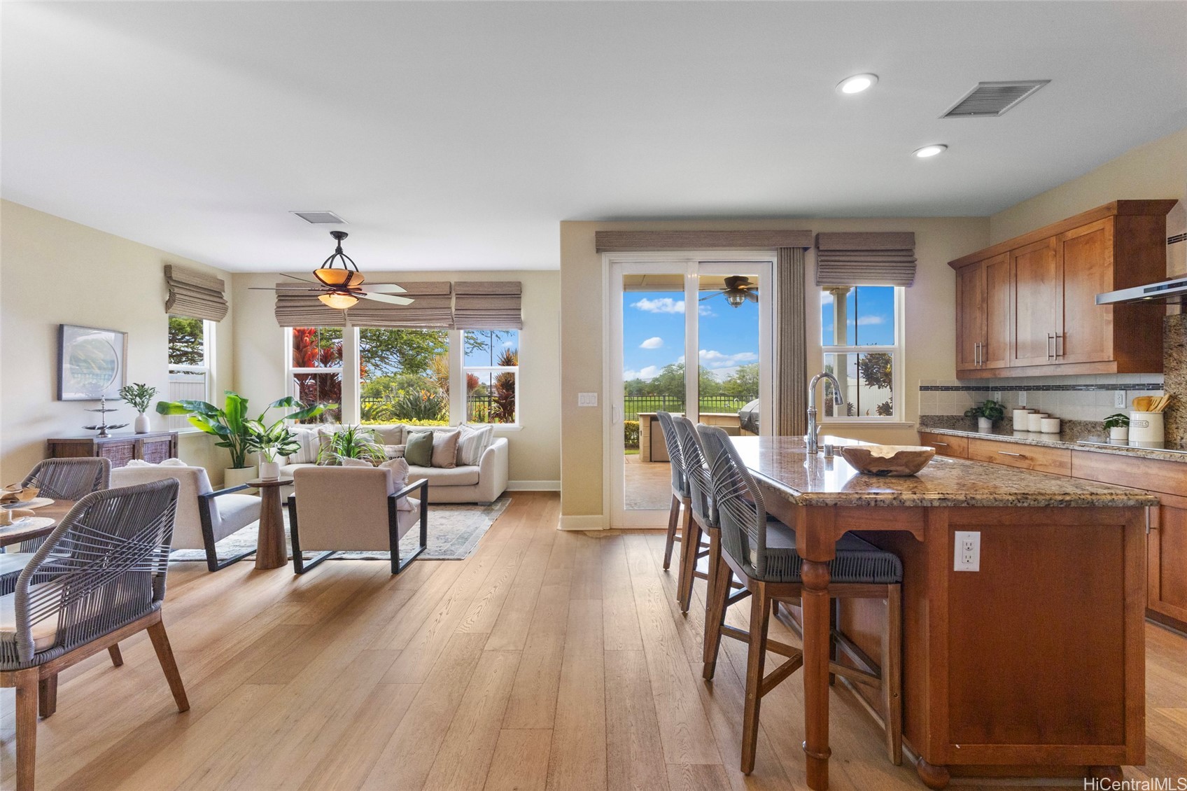 Now with Seller offering $20,000 Credit toward closing! Enjoy golf course views from this island oasis home. Overlooking the fairway of Hoakalei Country Club, this stunning 4 bed, 3 bath home offers an unmatched blend of comfort and island elegance. Its thoughtful design creates a seamless flow between indoor and outdoor living. The heart of the home is a modern, open-concept kitchen outfitted with granite countertops, stainless steel appliances and custom cabinetry. Just outside, the covered lanai leads to lush green space and a patio, featuring built in gas grills. Whether you’re preparing a meal or entertaining friends, this space is as functional as it is beautiful. The bedroom and full bath on the first floor provides convenience and ease of accessibility for guests or extended family. A versatile loft upstairs offers multiple use options — perfect for a home office, playroom, or media space. The primary suite boasts a private balcony with sweeping views of the golf course and Waianae mountain range just across the water, bringing the resort lifestyle right to your backyard.