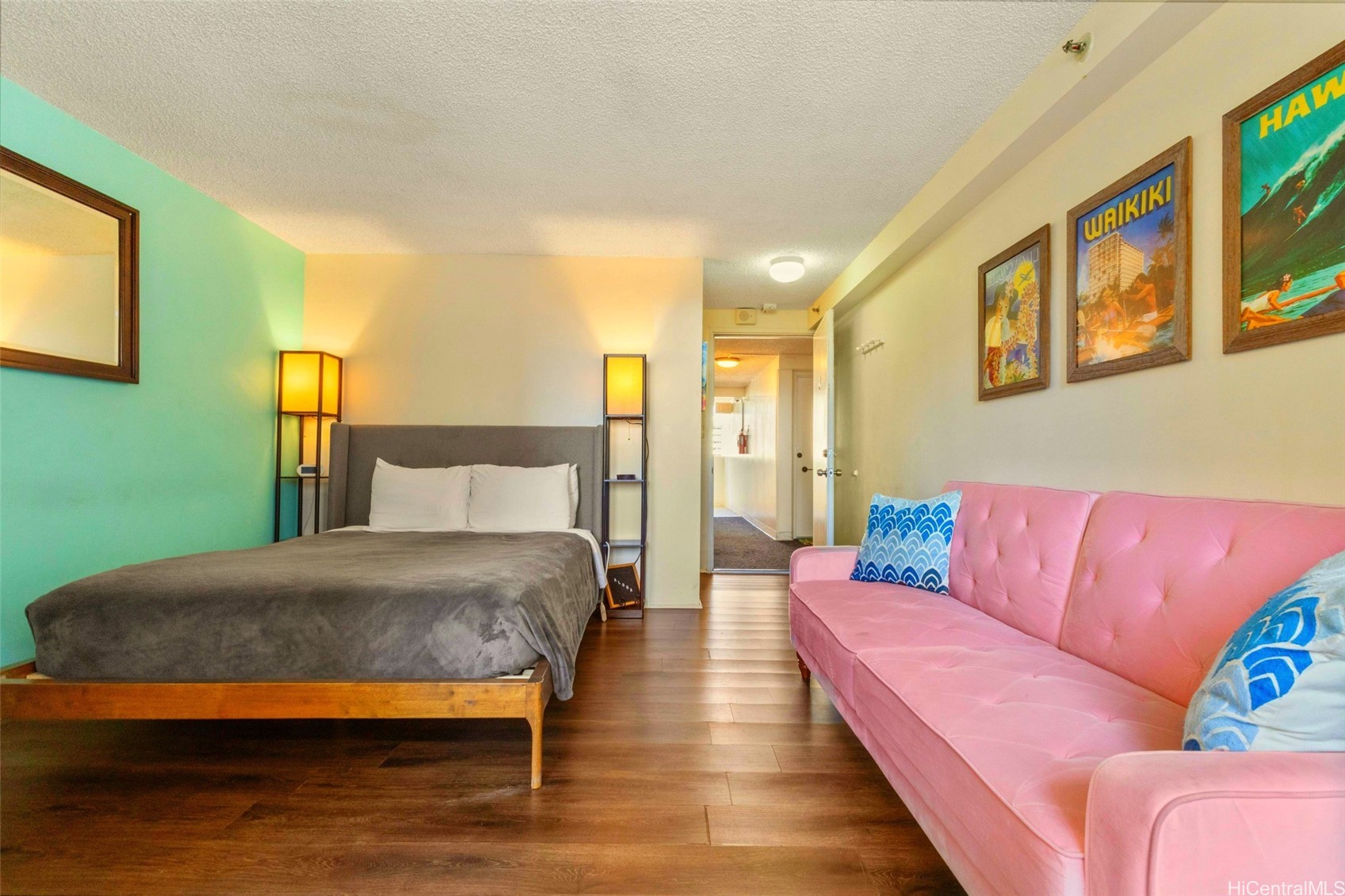 Iconic Waikiki getaway in the sought-after 05 stack! This Fee Simple legal short-term rental studio is known for its famous "Pink Couch"—featured in Forbes, Business Insider, and other top travel/Airbnb “best of” roundups—and it delivers the kind of stay guests remember. Step onto your lanai and enjoy ocean views and island breezes, all just minutes to Waikiki Beach, world-class dining, and shopping. Sold fully furnished, with strong rental history and solid income potential, this is a true turnkey opportunity. Building major improvements including spalling/painting (2020–2021) and a lobby renovation (2022–2024) with new automatic entry doors and refreshed artwork. Operations were also updated with a redesigned security area, FOB access, registration kiosk, and key vault system. Enjoy an on-site Resident Manager, security, surfboard storage, and bike racks. For added guest convenience, optional paid luggage storage is available for early arrivals/late departures so guests can explore hands-free. Maintenance fee includes electric & water (not sub metered), hot water, cable, internet, on-site management & security. Monthly special assessment through Dec 2027, prorated at closing.