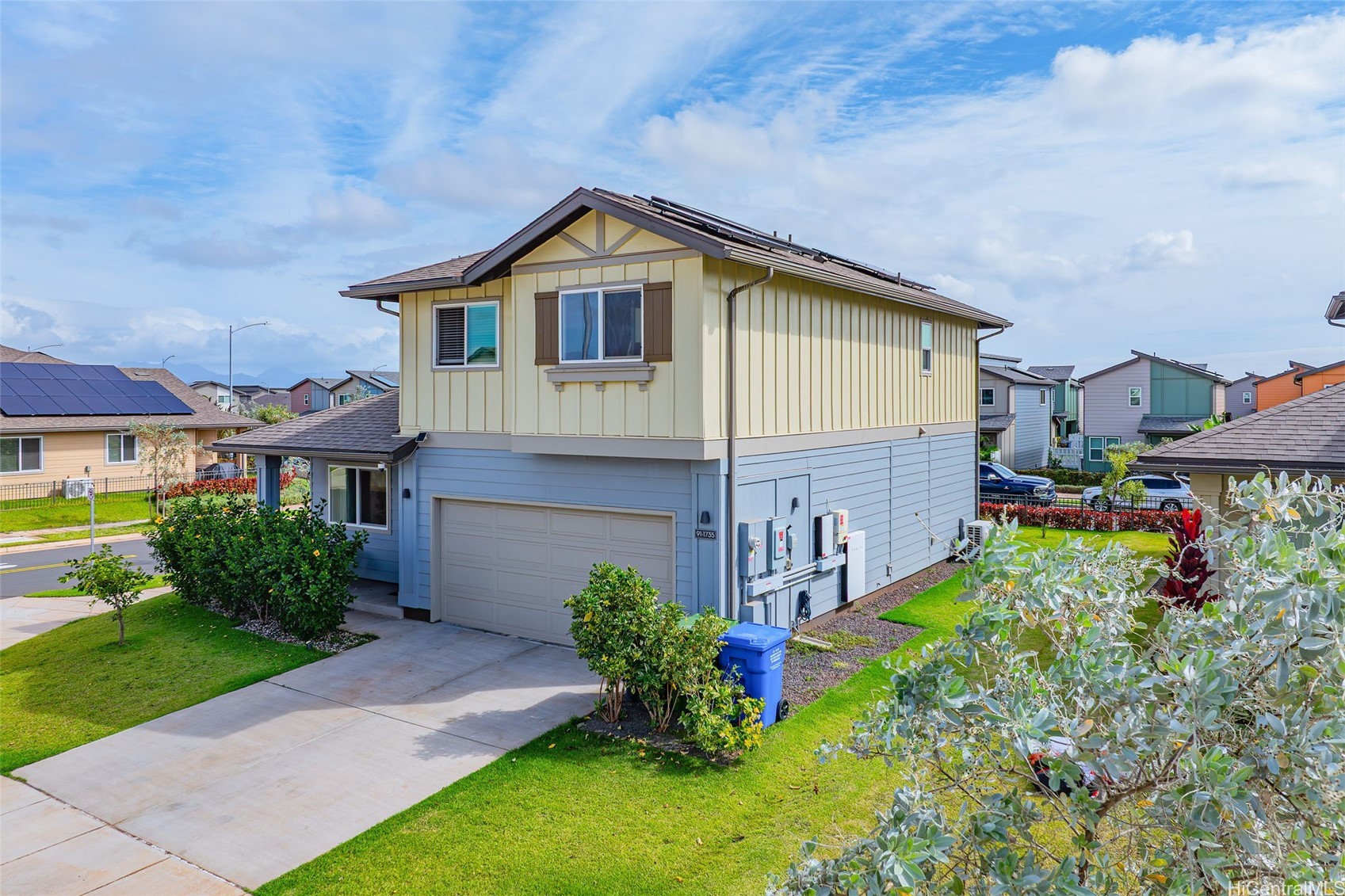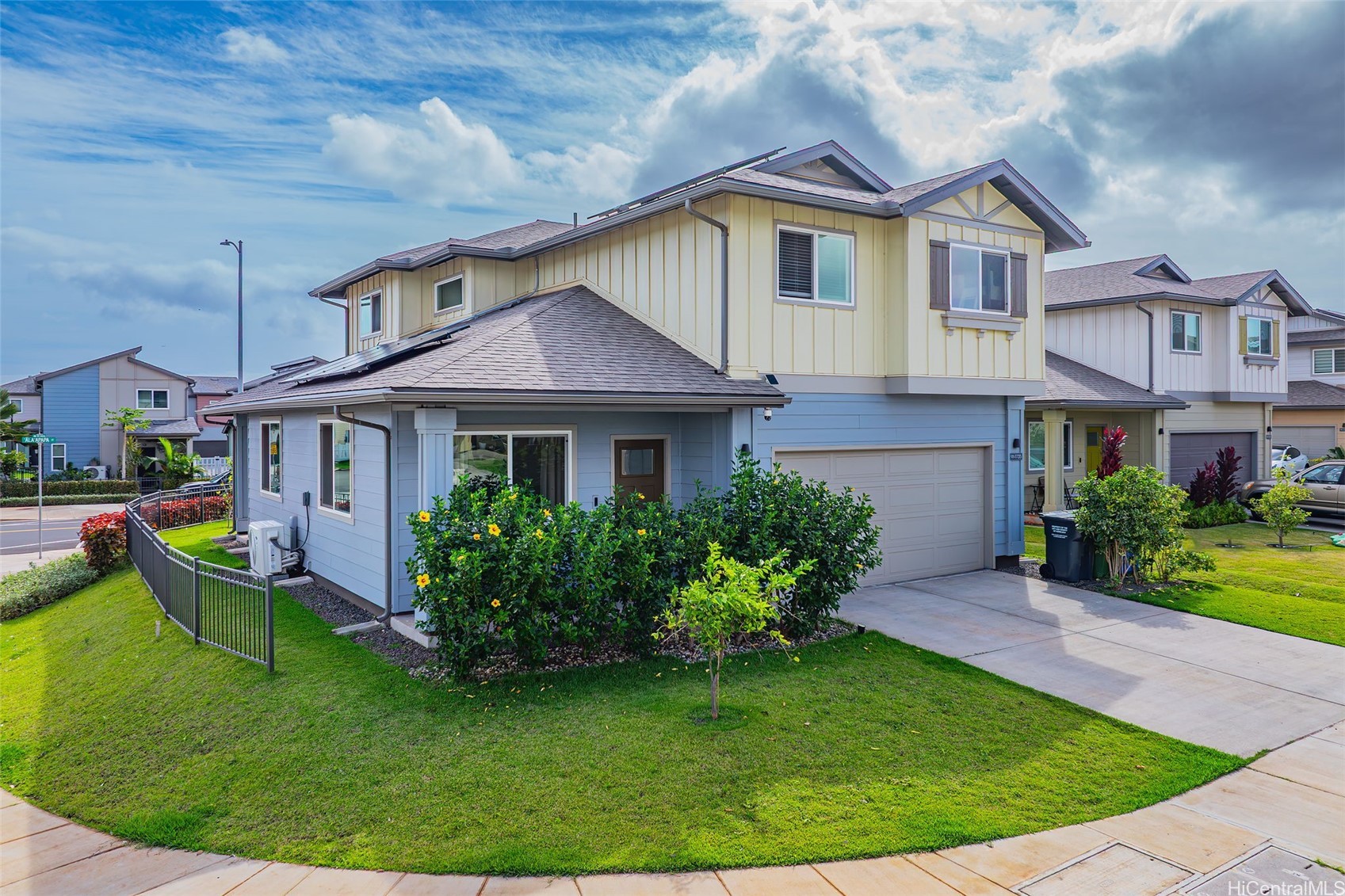 Located in Ho‘opili Kanalani, this 4-bedroom, 2.5-bath single-family home offers modern island living in a lower-density neighborhood with wider streets and longer driveways. Situated on a corner lot, this move-in-ready home features 1,720 sq. ft. of well-designed living space with two downstairs living areas, including a vaulted-ceiling living room and a separate family room open to the kitchen. The kitchen features white soft-close cabinetry, solid-surface countertops, stainless steel appliances, peninsula seating, and vinyl plank flooring throughout the downstairs and bathrooms, with plush carpeting upstairs. The second floor includes four bedrooms, two full baths, a built-in tech desk, and a primary suite with dual sinks and a walk-in shower. Additional highlights include split A/C, leased solar system, solar water heater, high-tech range hood, and a large interior walk-in pantry/storage room. Centrally located within Ho‘opili near the SoHo Community Center, soccer field, and Honolulu Skyline rail stations, with easy access to shopping, dining, and schools. A rare opportunity to own in one of Ho‘opili’s most thoughtfully planned neighborhoods.