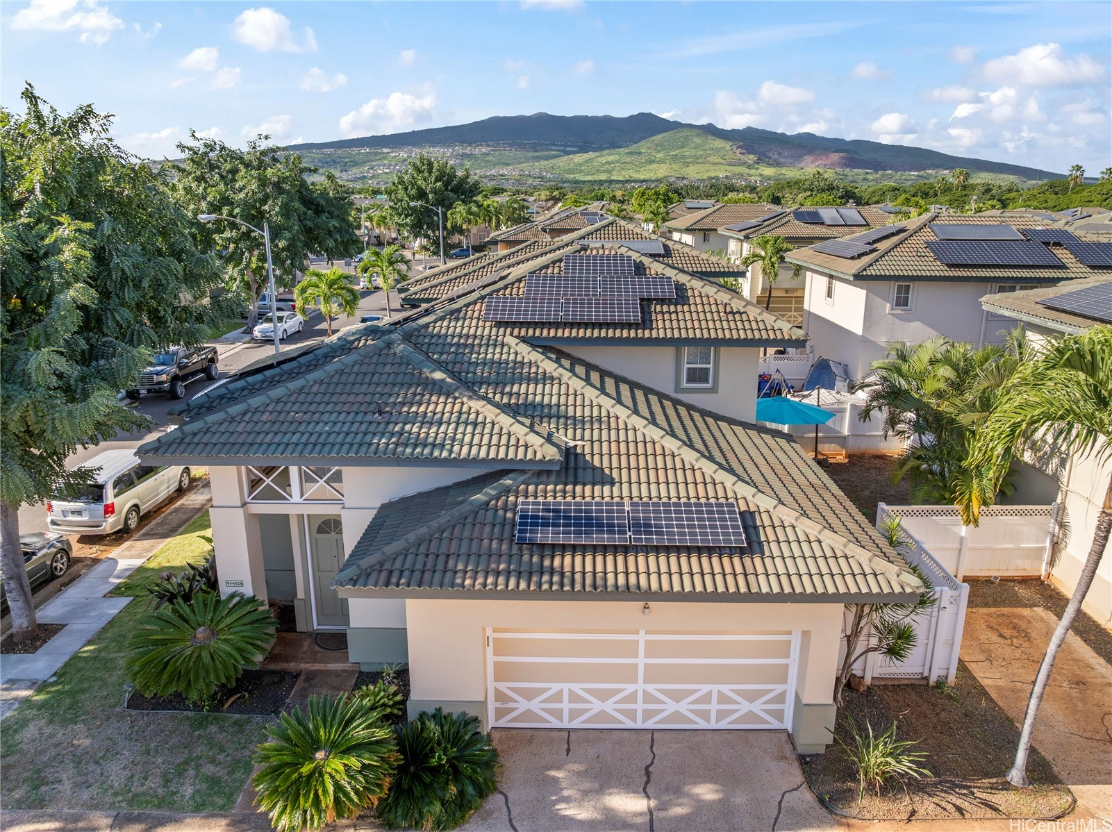 Corner lot home in the desirable Iwalani community of Kapolei. This property features a 2-car garage, an additional parking stall, and 15 owned photovoltaic panels for energy efficiency and long-term savings. The fully fenced yard offers generous outdoor space, perfect for relaxing or entertaining. Grand vaulted ceilings create a bright, open atmosphere throughout. The kitchen includes smart appliances and ample cabinetry, ideal for everyday living. Recently added split AC units provide comfort and coolness year-round. A full bedroom and bathroom on the first floor offers flexibility for guests, multi-generational living, or a home office. The primary suite also includes an updated shower bath and a custom closet with built-in organizers. Upstairs, you’ll find two additional bedrooms with built-in closets and a beautifully remodeled guest bathroom. The spacious backyard is easily accessible from both the dining area and the primary suite, creating seamless indoor-outdoor living. Ideally located near top schools, UH West Oahu, and Ka Makana Alii Mall, this desirable floor plan and prime location truly make this home a must-see.