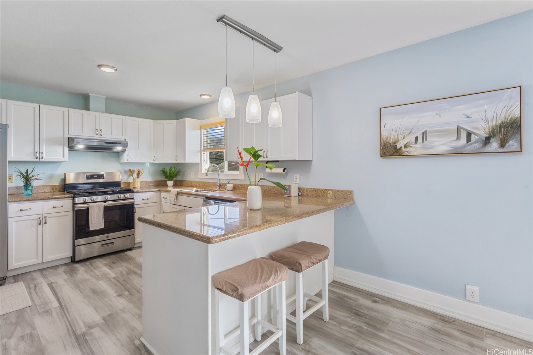 Rare beautifully maintained multi-generational opportunity in desirable Moanalua Valley! VA assumption to qualified buyers at 2.625% . This spacious 5-bedroom, 3-full-bath home features two distinct living areas a main space upstairs featuring 3-bedroom, 2-bath layout and downstairs 2-bedroom, 1-bath suite with wet bar. Can be used separately or together. Enjoy gorgeous mountain views with peek-a-boo ocean views and a primary suite with en suite bath. The home has nicely appointed quality finishes such as granite countertops, stainless steel appliances, luxury vinyl floors and hardwood. 1 Split A/C unit and 3 wall units and 13 OWNED solar panels and Tesla Powerwall. Step outside to a grassy yard perfect to garden with a covered lanai with mature lush tropical landscaping, creating a peaceful island oasis. Ideally located near Moanalua Valley Trail, Park, and Moanalua Valley Golf Club, with convenient freeway access, schools, and amenities. Approximately 3 miles to Fort Shafter and 6 miles to Joint Base Pearl Harbor-Hickam, 1.4 miles to Kaiser Moanalua Medical Center. A rare blend of convenience, flexibility, views, sustainability, and location