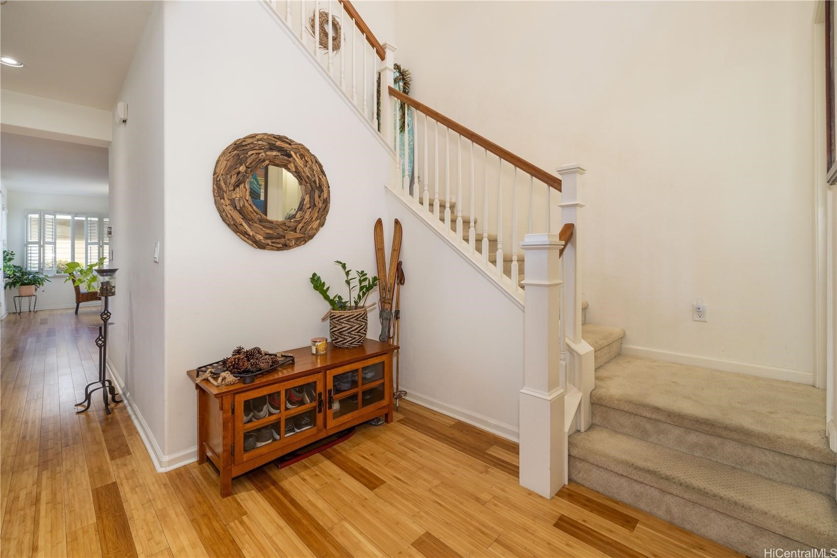 Spacious 4-bedroom, 2.5-bath home on a corner lot, featuring Berber carpeting upstairs, upgraded shaker cabinets, 42 NEW windows, plantation shutters and a large yard perfect for outdoor enjoyment. The primary suite offers an ensuite bathroom with a garden soaker tub and step-in shower. Energy-efficient photovoltaic panels help keep utility costs low. Conveniently located near shopping, Wai Kai and the esteemed Hoakalei Country Club. Monthly association fees cover essential amenities such as internet, basic cable, access to a dog park, and resort-style recreation center with tennis and pickleball courts, pool and hot tub.