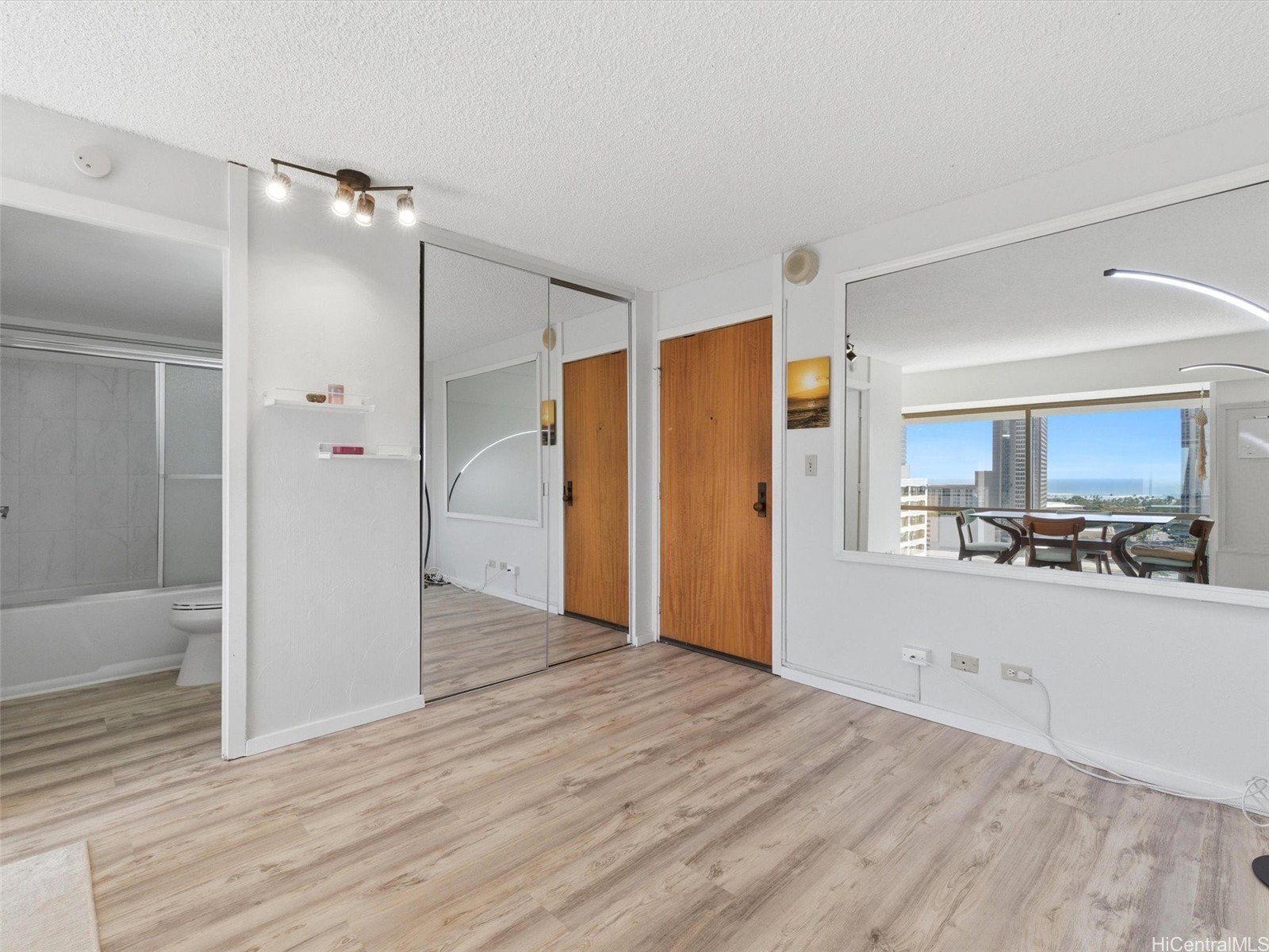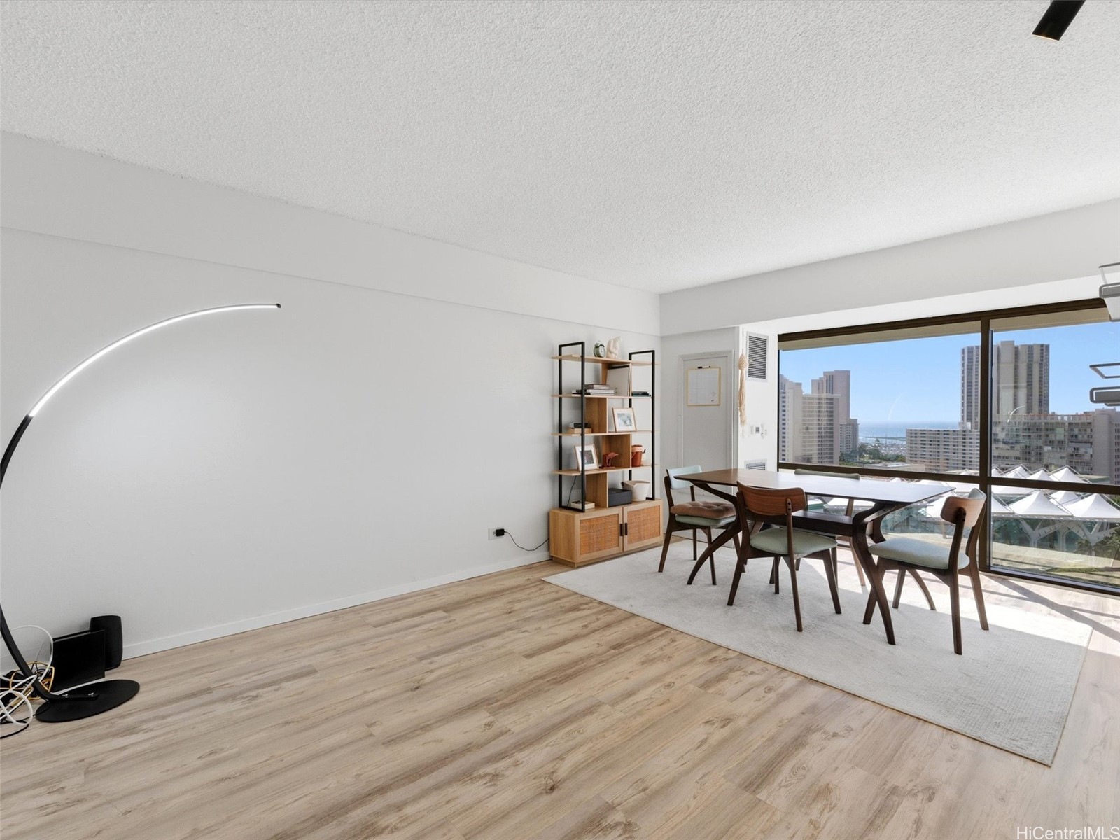 Beautifully updated studio in a rare mixed-use building, ideal for owner-occupants, professionals, or live/work use. This modern residence features luxury vinyl tile flooring, sleek kitchen and bath cabinetry, central AC, and a cleverly concealed closet for a streamlined layout. Floor-to-ceiling windows provide abundant natural light and are complemented by remote-controlled shades for added comfort and privacy. Residents enjoy resort-style amenities including swimming pool, saunas, private health spa, and recreation deck with sports courts and jogging path. Conveniently located near Waikiki and Ala Moana with easy access to beaches, shopping, dining, convention center, and bus lines. Excellent opportunity to own a turnkey unit in the heart of Honolulu.