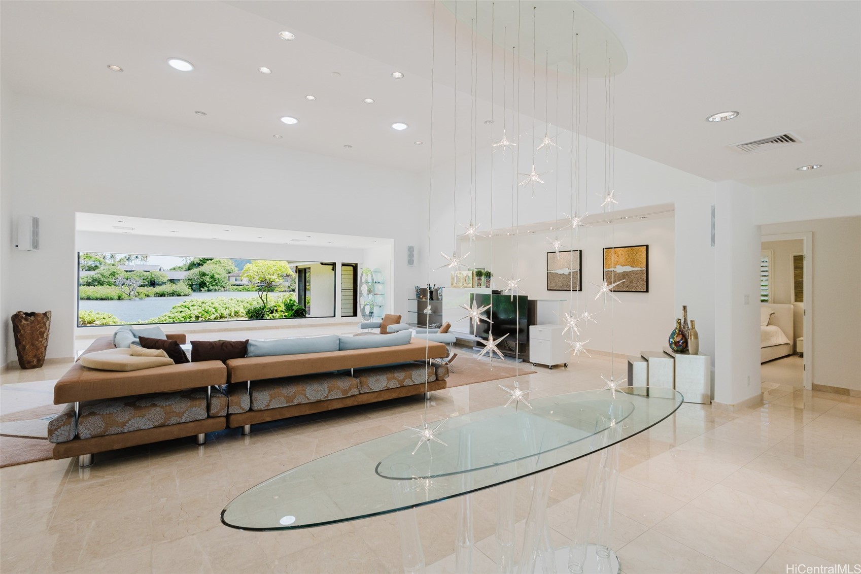 Back on Market. Waterfront residence located within a private, gated community, offering a setting defined by high ceilings and abundant natural light. The designer kitchen provides both style and functionality with water views. The property features a private dock with direct access suitable for activities such as kayaking or fishing. The home backs onto the historic Kanewai Fishpond and the Paiko Lagoon Wildlife Sanctuary, providing a unique waterfront environment. Enjoy a peaceful setting with views of the lagoon and surrounding natural landscape. Here, your daily soundtrack is the gentle rustle of native reeds and the soft call of the resident Hawaiian ducks (koloa maoli) gliding across the pond.A rare opportunity to own a waterfront property in a gated community with direct water access and proximity to protected natural areas.