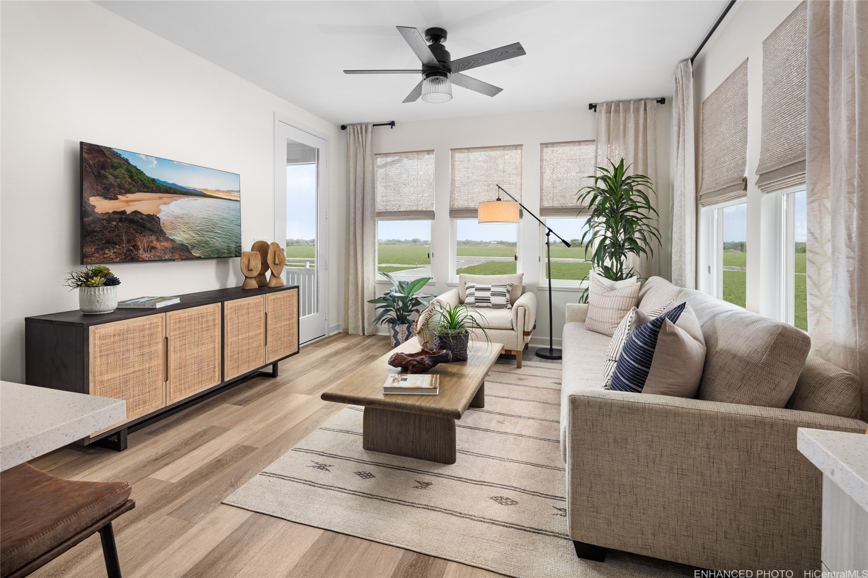 Available Now! Welcome to Ka’ulu by Gentry, the newest residential community in Kalaeloa! This brand new, beautiful 3 bedroom 2 bath home with a garage offers Interior appointments such as: 9” ceilings, designer laminate cabinets with soft close; luxury vinyl planks throughout; solid surface countertops, Stainless steel appliances, spacious primary walk in closet, mirrored doors & more. Numerous energy saving features to keep your bills low: spray foam insulation in the ceiling & exterior walls; central AC-high efficiency rated SEER2 (16+)certified; low-E impact-resistant vinyl windows; solar water, digital thermostat; LED lighting package; insulated roll-up garage door; (EV)electric vehicle ready; energy star appliances. . Boasting a huge covered lanai, and a great location, only a quick jump to the freeway and a few minutes to the beach, shopping and restaurants! Seller offering a 3% credit ($22,470) for closing costs when financing through Gentry Home Loans. Photos are of model home.