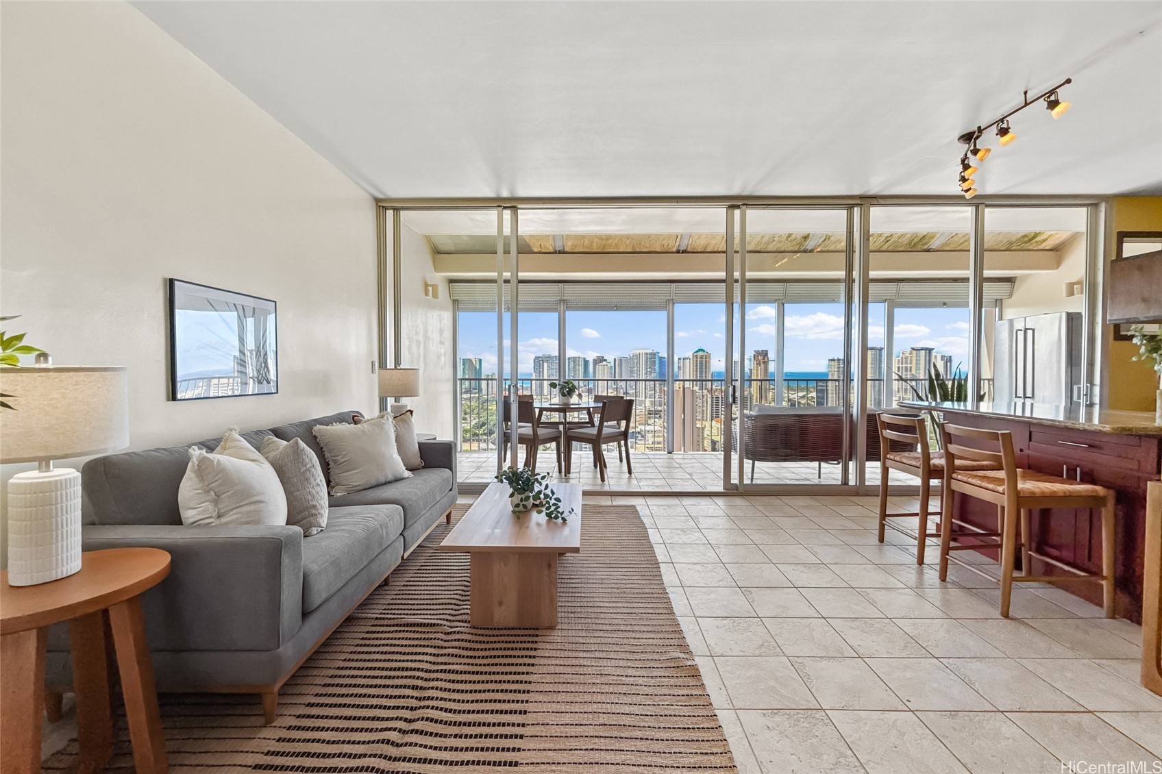 Welcome to 1520 Ward Ave #1402, a penthouse-level 2-bedroom, 1-bath condo offering incredible ocean and city views in the heart of Honolulu. This bright and breezy unit features a spacious 200 sq ft covered lanai with hurricane shutters—perfect for enjoying sunsets, island breezes, and panoramic cityscape views. Inside, the home features tile flooring, granite countertops, and an efficient open layout designed to maximize natural light and capture the views. The unit includes all major appliances, including an in-unit washer and dryer, making it move-in ready for an owner-occupant or investor. Conveniently located near Kakaako, downtown Honolulu, and major hospitals, you'll enjoy easy access to shopping, dining, entertainment, and employment centers. The building also offers a residents’ pool, providing a great place to relax and enjoy the island lifestyle. The unit includes one covered parking stall, and the maintenance fee covers gas, water, and sewer, helping simplify monthly expenses. If you're looking for penthouse living with stunning views in a prime Honolulu location, this is a must-see opportunity.