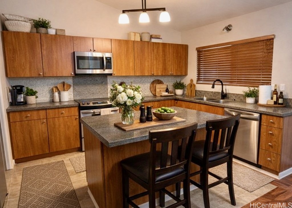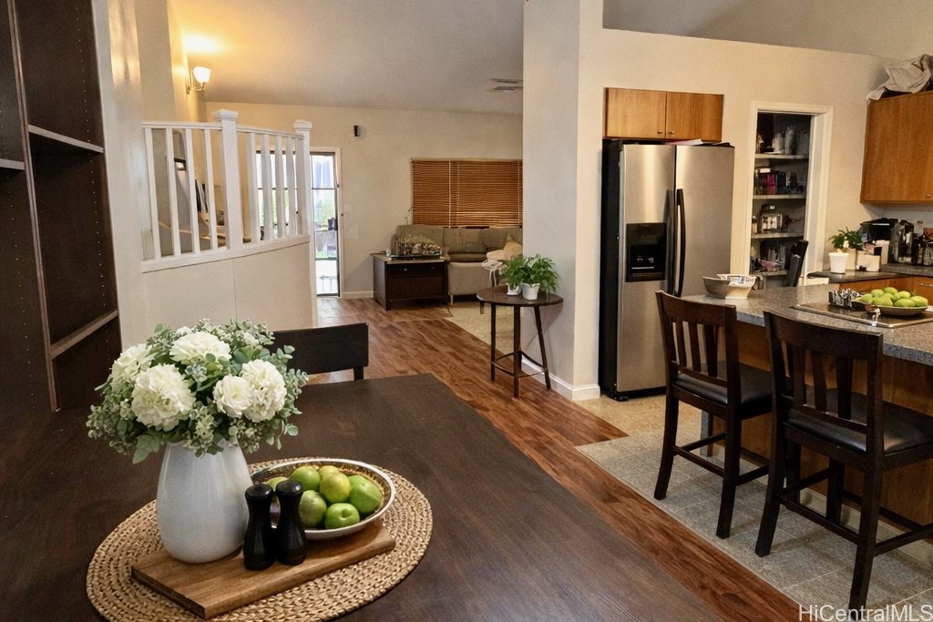 Beautiful single-family home in Ewa by Gentry Prescott featuring a spacious open floor plan and soaring vaulted ceilings that create a bright and inviting atmosphere. This well-maintained residence offers comfort and modern island living with an owned photovoltaic system and Tesla battery for energy efficiency and savings. The flexible layout includes a full bedroom and bathroom on the first floor, ideal for guests, extended family, or a home office. The kitchen offers ample cabinetry, generous counter space, a large pantry, and an island with countertop seating, opening seamlessly to the main living areas for easy entertaining. Relax under the covered lanai, perfect for gatherings or enjoying the private yard. Additional features include central AC and a lawn sprinkler system. Conveniently located near parks, golf courses, beaches, and Kapolei shopping, dining, and entertainment. First available showing is 4/1/26.