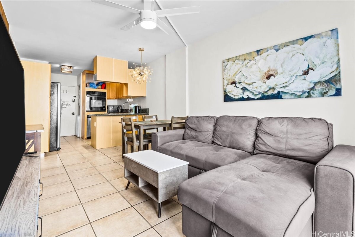 Fee simple two-bedroom unit with one covered parking stall, ideally located in the heart of Waikiki. This fully furnished residence is beautifully decorated and move-in ready. Enjoy the convenience of an on-site resident manager for added peace of mind. Enjoy an unbeatable location just one block from the International Market Place. This spacious, fully remodeled two-bedroom residence features a completely tiled floor, an updated kitchen, three quality ceiling fans, and a private balcony lanai. Well-maintained and move-in ready, the unit includes a refrigerator, oven, cooktop, dishwasher, AC units in both bedrooms, and a newer washer and dryer. Situated in a secure building with fob-controlled access for the main entry, elevator, and stairwell, plus security cameras and an on-site resident manager for added peace of mind. Just a few blocks from world-famous Waikiki Beach- this prime location truly has it all.
