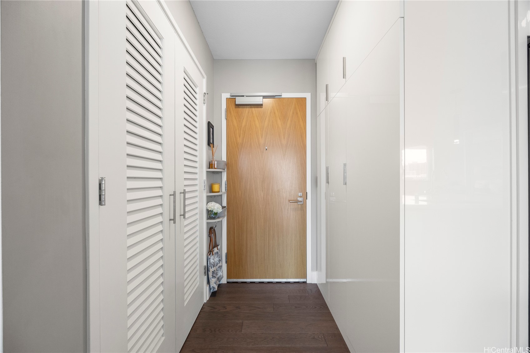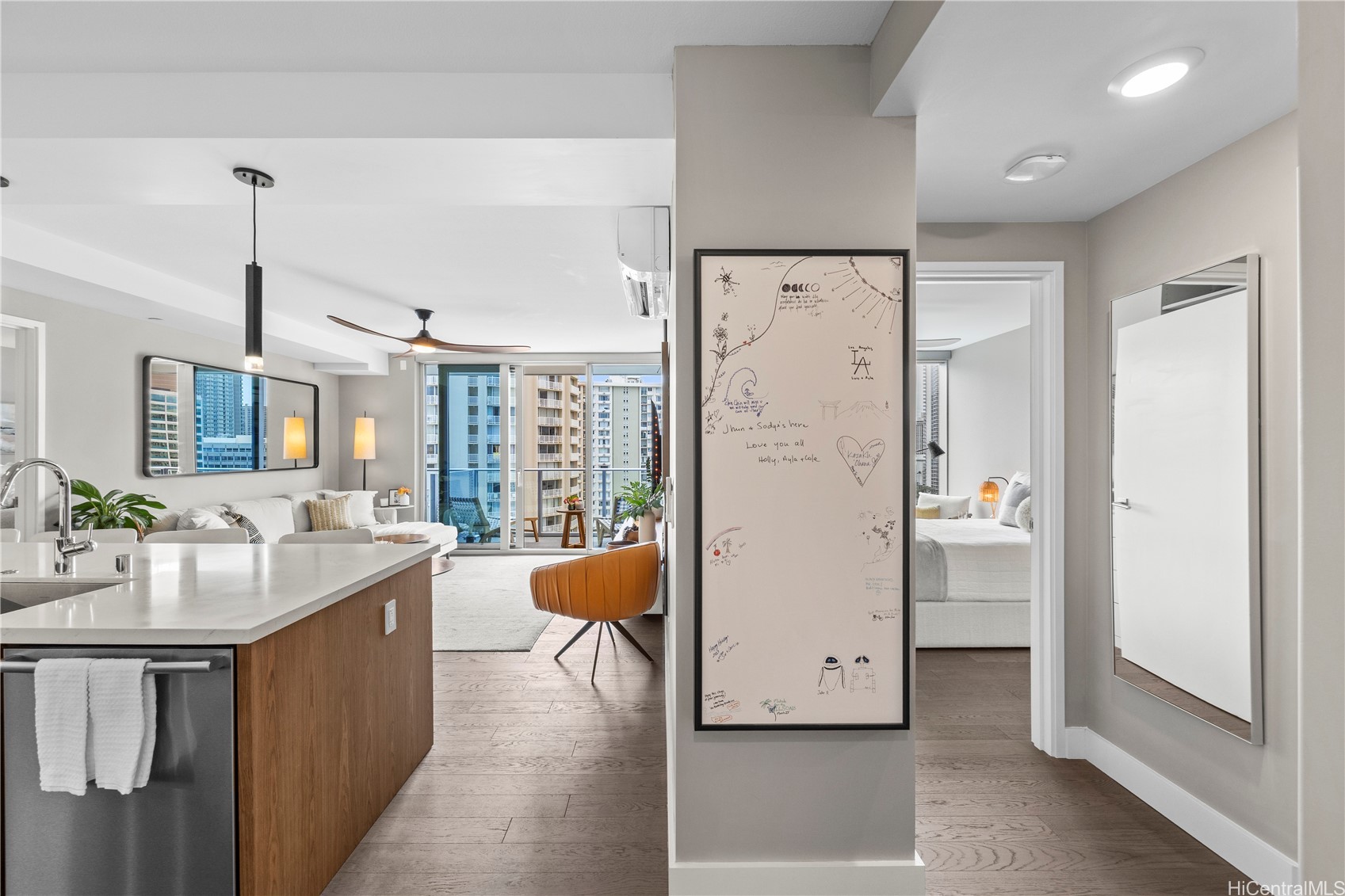 Ideally located just moments from Ala Moana Center and near Ala Moana Beach Park, this exquisitely upgraded and meticulously maintained 2-bedroom, 2-bath residence at Azure Ala Moana blends elevated design with everyday functionality and custom enhancements throughout. Rich French oak engineered wood floors run throughout, complemented by warm neutral tones. The living area features elegant wall paneling and a 65-inch TV with LED lighting. The reimagined entry offers full-height custom cabinetry for shoe and pantry storage, plus a functional drop zone that integrates seamlessly with the home’s finishes. Both bedrooms include custom closet systems and storage beds for optimal organization, while the guest room features full-height built-ins and a Frame TV. Bathrooms are upgraded with porcelain flooring, designer tilework, and additional fixtures for a refined look. Additional highlights include contemporary ceiling fans, motorized shades throughout, and blackout shades in bedrooms. Designer pendant lighting enhances the kitchen. Offered fully turnkey with designer furnishings, artwork, accessories, kitchenware, and bathware—creating a true move-in-ready lifestyle.