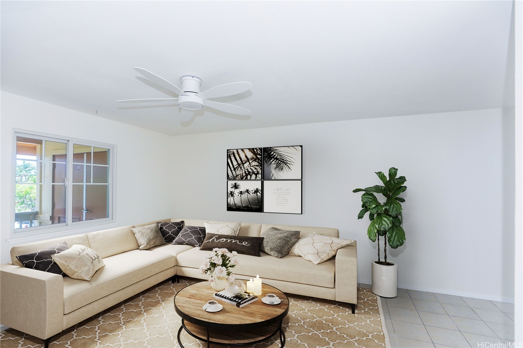 Two bedrooms 2 baths 2nd floor unit recently updated with fresh paint throughout, luxury vinyl flooring in both bedrooms, new dual pane windows, 3 new ceiling fans, and 3 new smoke detectors. Ceramic tile floors in front entry, living area, dining, kitchen and hallway. Lanai storage closet with side-by-side washer/dryer & water heater. Amenities include a clubhouse/recreation area and guest parking plus access to the wonderful Villages at Kapolei amenities (pool, clubhouse, meeting/party rooms, etc) and Kapolei Community Park with playground, basketball and pickleball/tennis courts. The community has FULL hurricane coverage, is VA APPROVED, & PET-FRIENDLY. Located minutes from everything Kapolei has to offer - Ka Makana Ali’i Mall, Costco, Down to Earth, Kapolei Golf Course, and more. A $54 monthly Community Association fee entitles all residents exclusive access to the Villages of Kapolei Community Pool and Recreation Center. One or more photos have been enhanced.