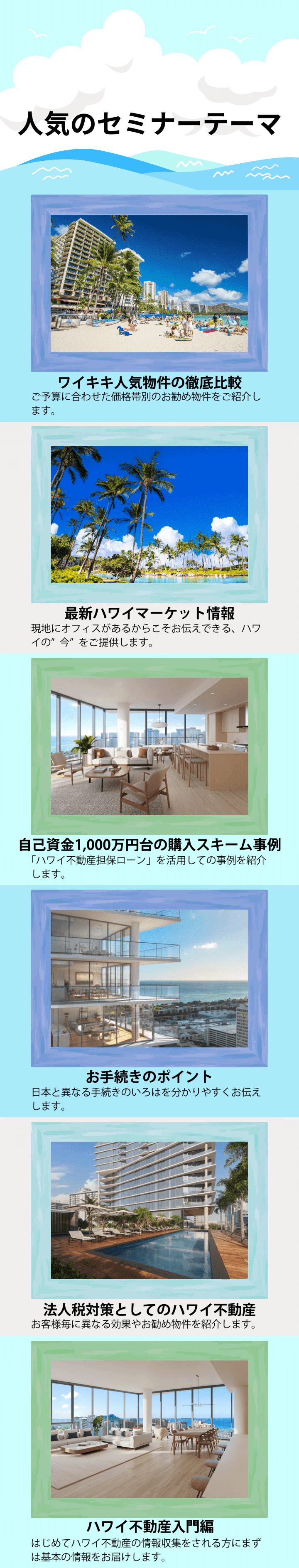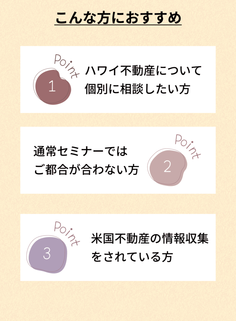 開催場所 GINZA SIX 11階/オンライン 募集中 WEBで申し込む お電話で申し込む(10:00~18:00) 0120-268-288 セミナー詳細情報 開催場所 GINZA SIX 11階/オンライン 日時 予約制 スケジュール 随時開催 9時から20時の間でのご希望をご調整致します。 平日・休日問わず、まずはお気軽にお問い合わせ下さい。 定員 1名より 費用 無料 お申込み 面談方法 *必須 来社面談 オンライン面談 ご希望日時 *必須 第1希望日 第1希望時間 選択ください 第2希望日 第2希望時間 選択ください お名前 *必須 お名前(フリガナ) メールアドレス *必須 電話番号 *必須 郵便番号 - 住所 *必須 マンションビル名 ご予算 選択ください 〜$200,000 〜$500,000 〜$700,000 〜$1,000,000 〜$1,500,000 〜$2,000,000 〜$2,500,000 〜$3,000,000 〜$5,000,000 それ以上 購入目的 選択ください 別荘購入 法人税対策 資産運用 外貨資産の保有 移住・留学 その他 その他、ご質問やご要望等ご記入ください。 ご登録いただいた個人情報は、以下の目的で当社において正当な事業遂行の範囲内で利用したします。 お客様からのお問い合わせへの対応、ご請求のあった資料の送付のため サービスや物件、商品に関する情報提供や提案のため 新規事業や新規サービス、新商品、セミナー等の案内や情報提供のため お客様がお申込みになったサービスなどのご提供及び確認、案内並びにアフターサービス、サポートのため メールによるお知らせや情報誌、メールマガジン等の送付のため その他、上記利用目的に付随、関連する目的 プライバシーポリシーをお読みいただき、同意の上で確認画面へおすすみ下さい。 なお、必須項目を入力いただけない場合は、当社のサービスをご利用になれない場合がありますので予めご了承ください。ご提出いただいた個人情報に関して、利用目的の通知、個人情報の開示、訂正、追加、削除、利用停止、消去、第三者提供停止を求めることができます。これらの請求をおこないたい場合は、下記の窓口までご連絡ください。 【個人情報お問い合わせ窓口】 担当:個人情報保護管理者(株式会社ファミリーコーポレーション 総務人事部長) 住所:〒104-0061 東京都中央区銀座6-10-1 GINZA SIX 11F 電話:03-6228-5861 mail:info@family-group.jp プライバシーポリシーについて同意する 確認画面へ